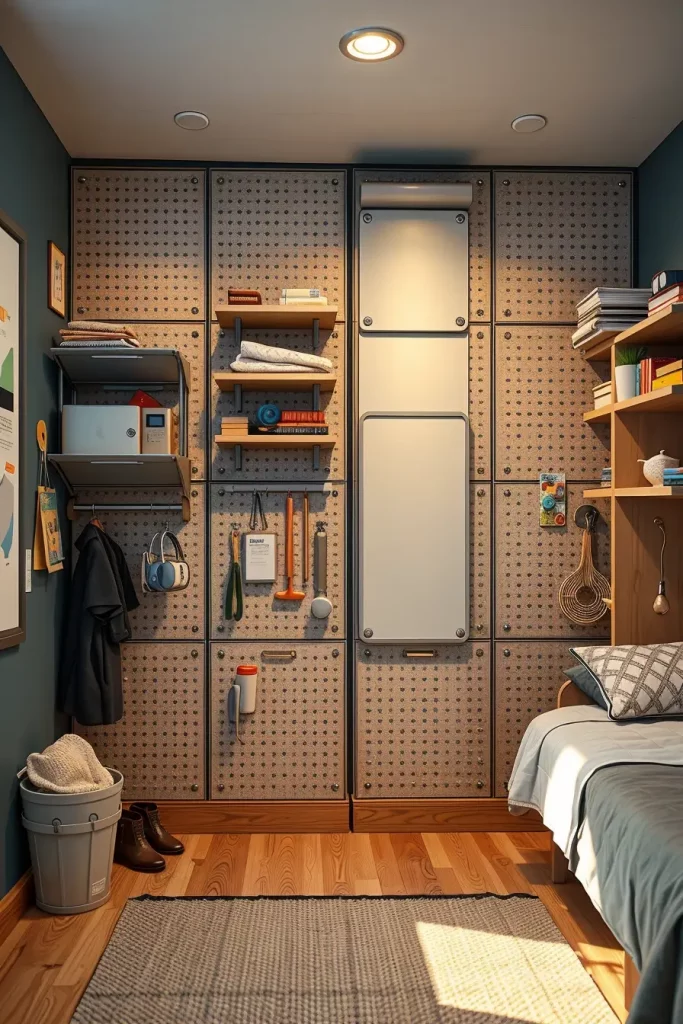 Vertical storage is a game changer in Dormtropolis where every square foot is at a premium. These walls combine a system of built-in shelving with pegboard panels and pull-down compartments that can hold clothes, gear, books and even mini-fridges. It is designed to have as much storage as possible, and still have everything within easy reach and aesthetically neat.