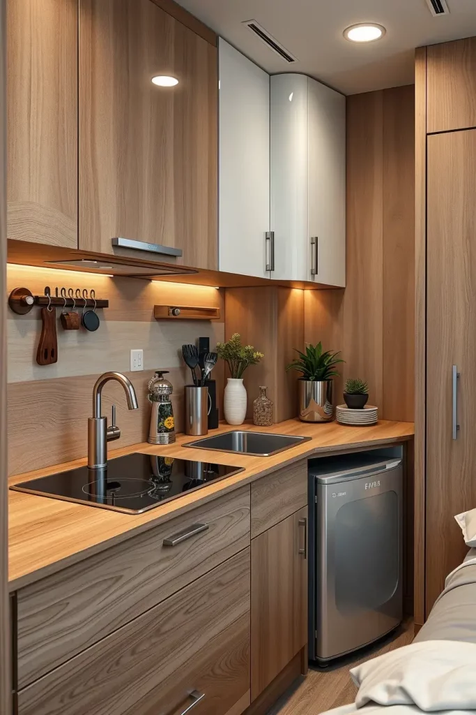 A standard installation has an induction cooktop concealed under a sliding countertop, a roll-out sink with low-consumption faucet, and a convection microwave mounted in an upper cabinet. Refrigeration is drawer type, and compressors are whisper quiet. The cabinets are clean, white or oak laminate, fingerprint resistant with LED strip lighting.