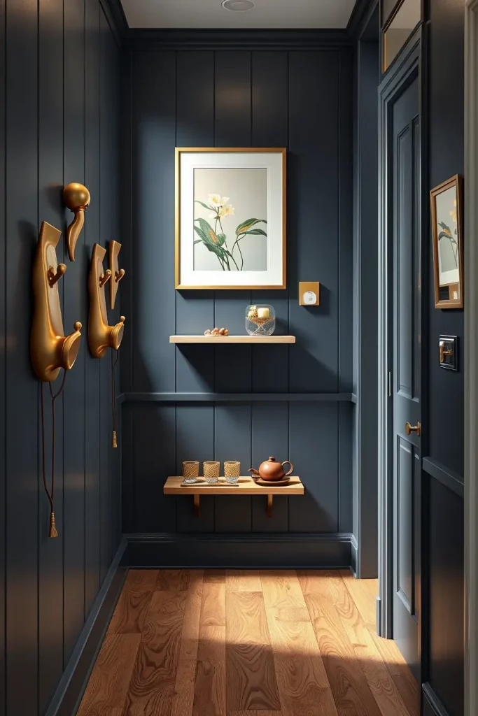 I liked using a wall with navy panels that had rows of white porcelain hooks which made different shadows whenever something was hung on them. Real Simple highlighted in an article that contemporary entry areas look good with hooks of different materials set up in creative configurations, like you’d see in a gallery.