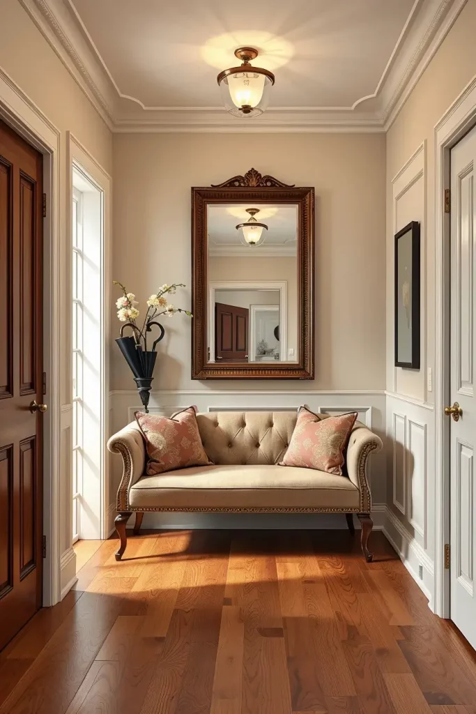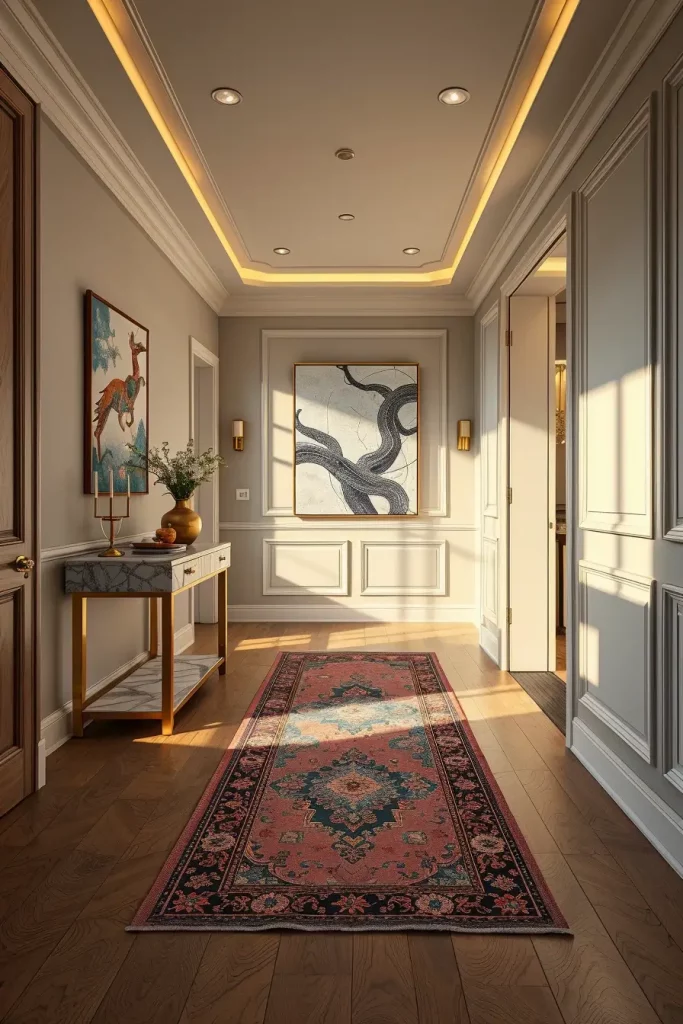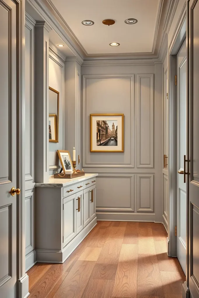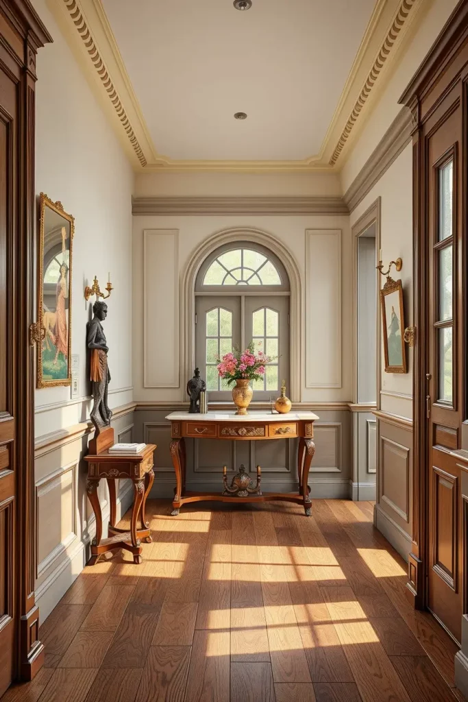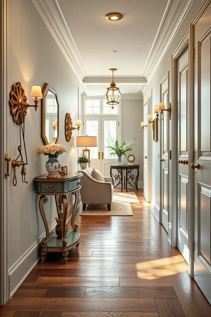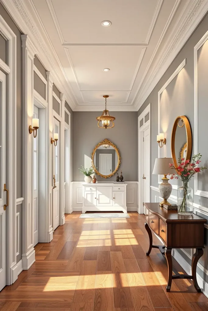 Crown molding and baseboards can easily be forgotten, even though I believe they are important for any elegant hallway. These parts of the design mark out the space and give a base for moving forward in choosing paint and selecting furniture. They allow me to highlight the ceiling and separate one space from another.