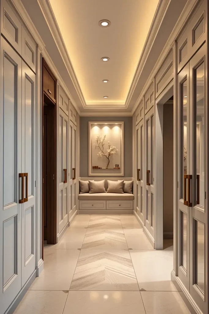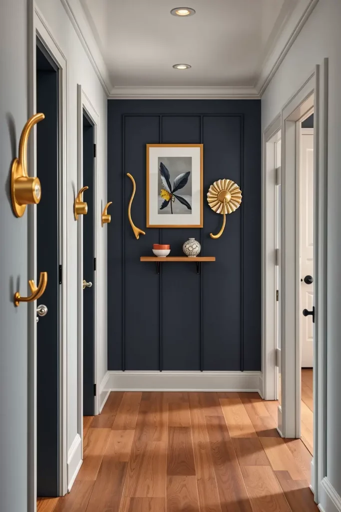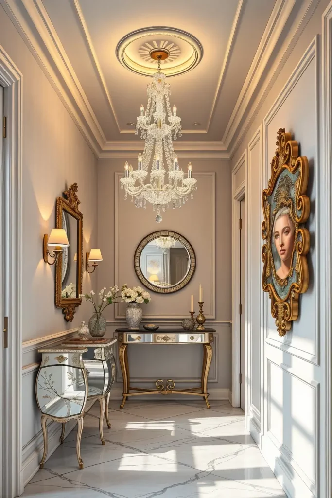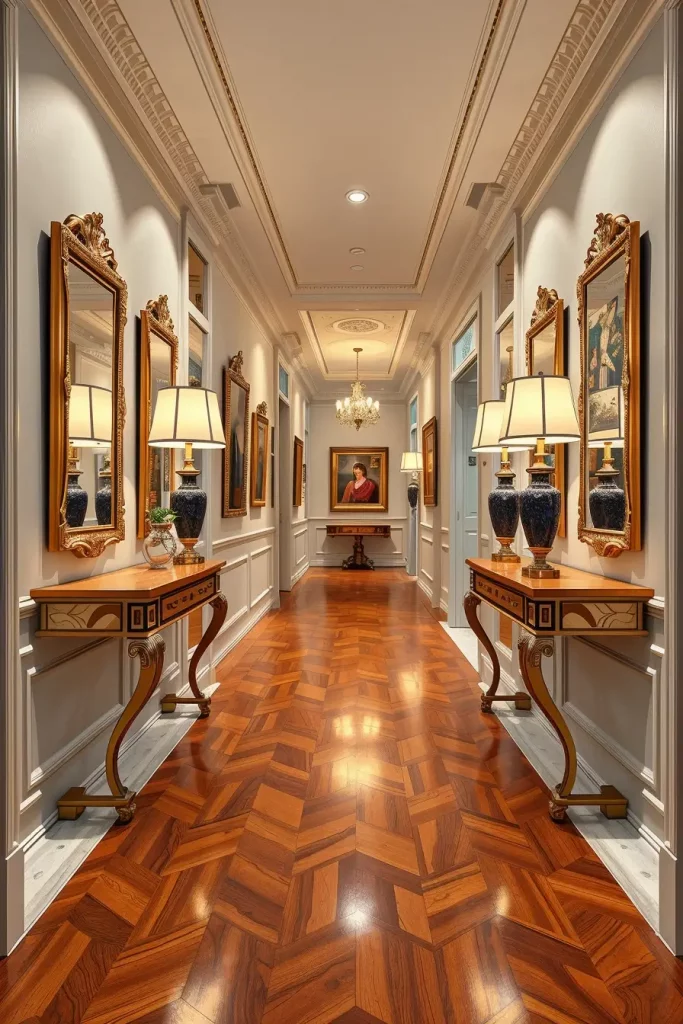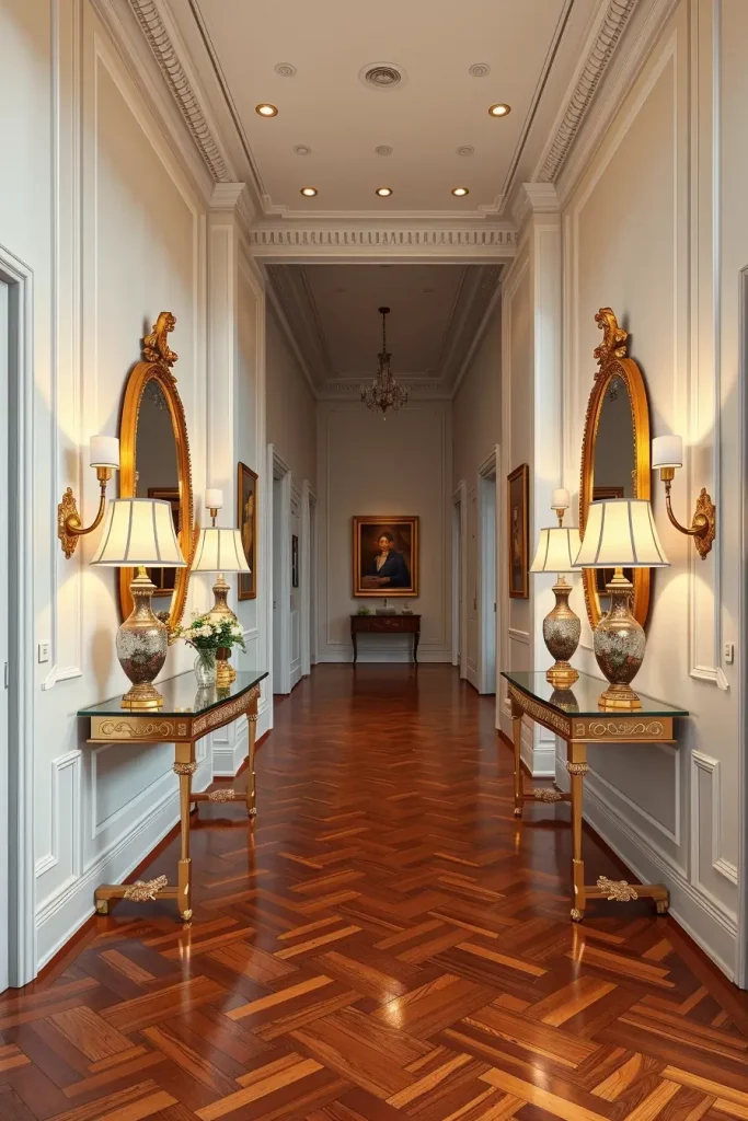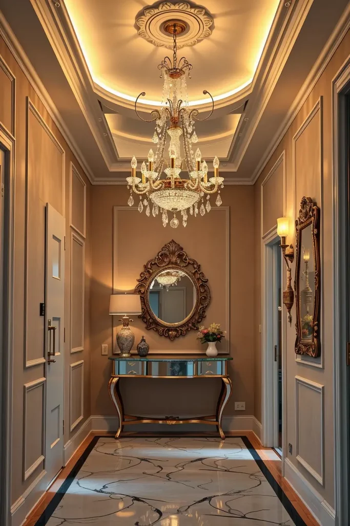 Crown molding and baseboards can easily be forgotten, even though I believe they are important for any elegant hallway. These parts of the design mark out the space and give a base for moving forward in choosing paint and selecting furniture. They allow me to highlight the ceiling and separate one space from another.