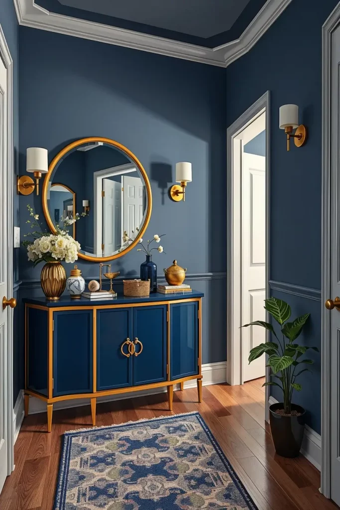 To explain, picking a navy-and-brass style can give you a blue console, golden edged mirror, brushed gold hooks and a runner with a blue pattern. Just by adding books or decorative bowls of the right color, you can match the palette. If you want, add a hint of olive green or terracotta to your decor with flowers or candles so you have something different.