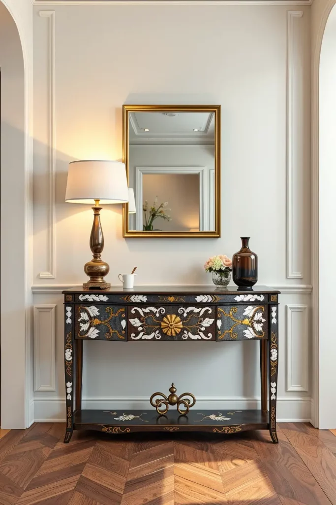 I’ve always been fascinated by how art can be seamlessly woven into functional design. Bringing in art-inspired furniture decorated with inlays can quickly add a touch of class to your hallway. They do more than decorate a space—they illustrate a history, pay tribute to art and attract everyone’s attention when you walk in. With neutral or softly-textured walls, they still fit with the decor and make a statement.