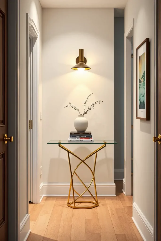 These days, I often style hallways using a glass console with a brass frame. In daylight, the console lets light shine through and in the evening the brass gives off a warm glow from below. Elle Décor recommends such transparent surfaces in small hallways to “extend space and reflect light,” and I’ve seen this trick work wonders in compact city apartments.