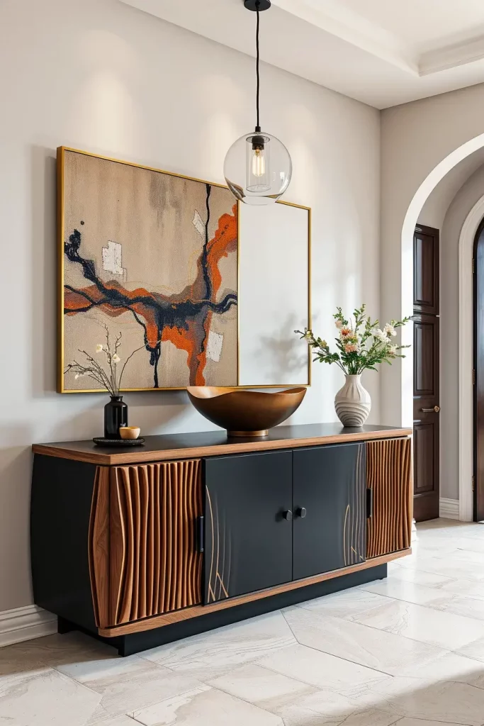 The purpose of a sideboard is important to me, so I go for models that include soft-close drawers blended with both open and closed storage. Using natural wood finishes, lacquer colors and matte black makes for a good choice. Hallways can become more identifiable with geometric art, fluted walls or inlays of metal on the door.