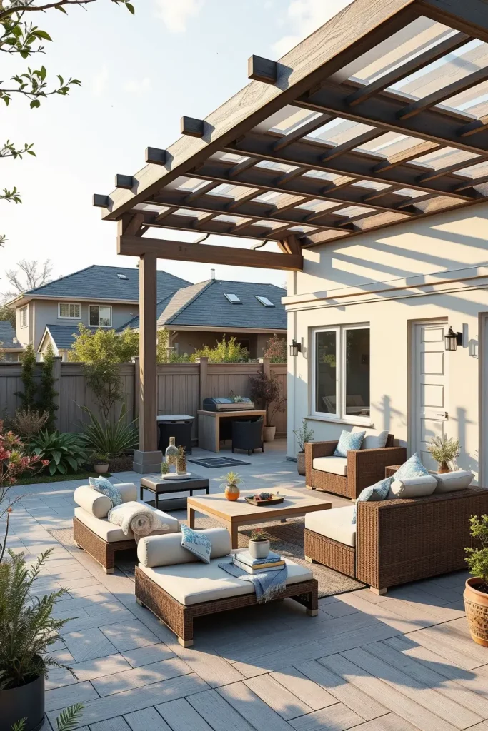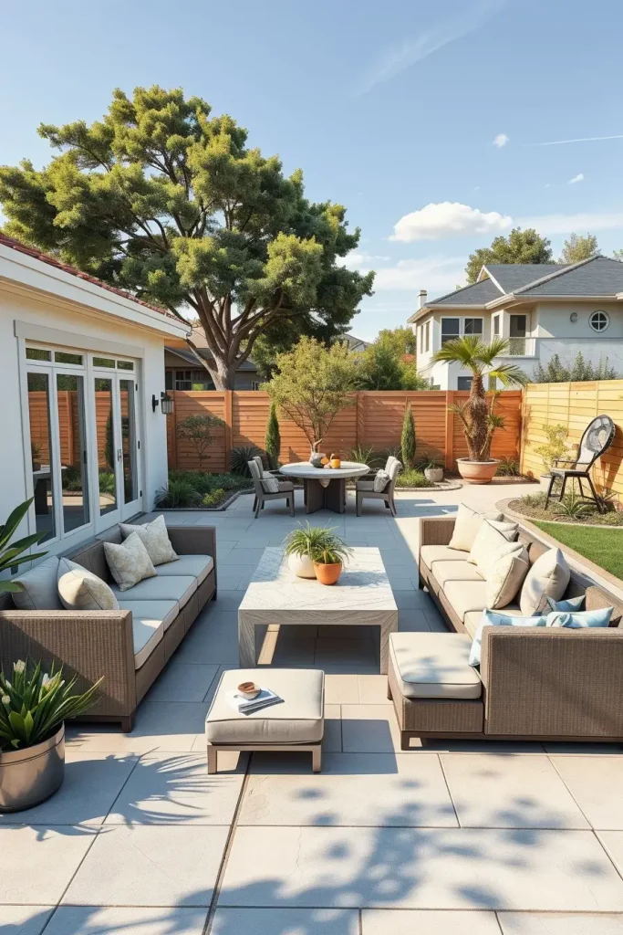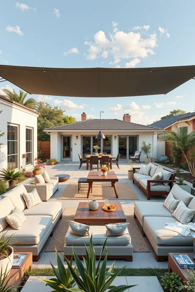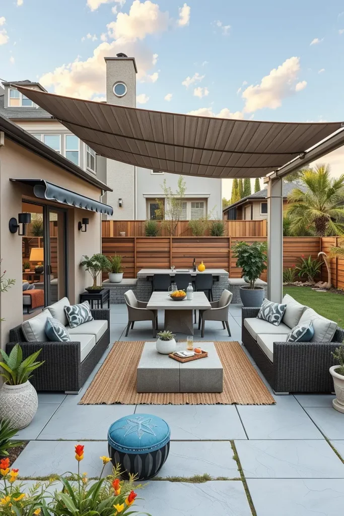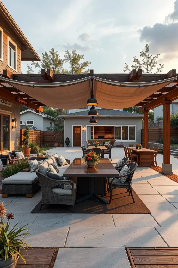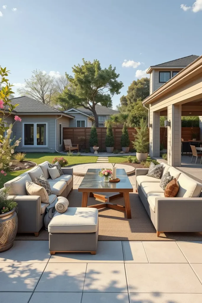Key furniture pieces include sectional outdoor sofas, long dining tables, and movable accent chairs that can adapt to different group sizes. I always suggest lightweight yet sturdy materials so the space can be reconfigured effortlessly. Shade structures, such as pergolas or retractable canopies, help define zones without closing them off.