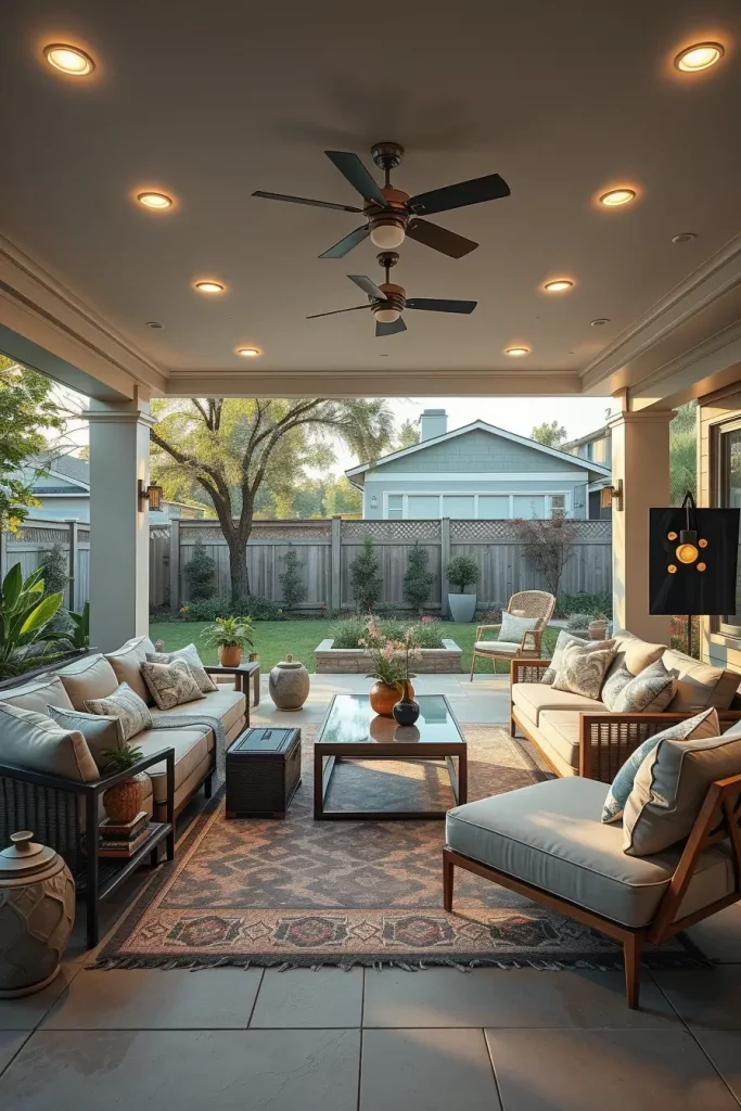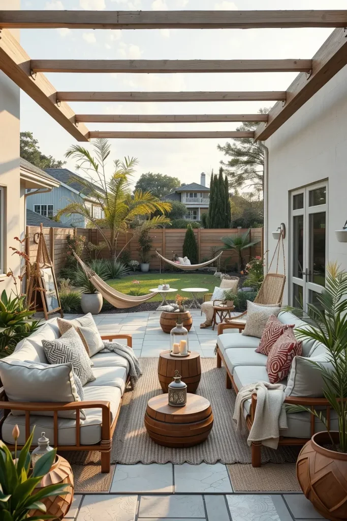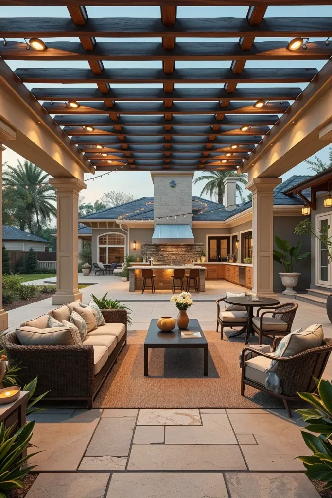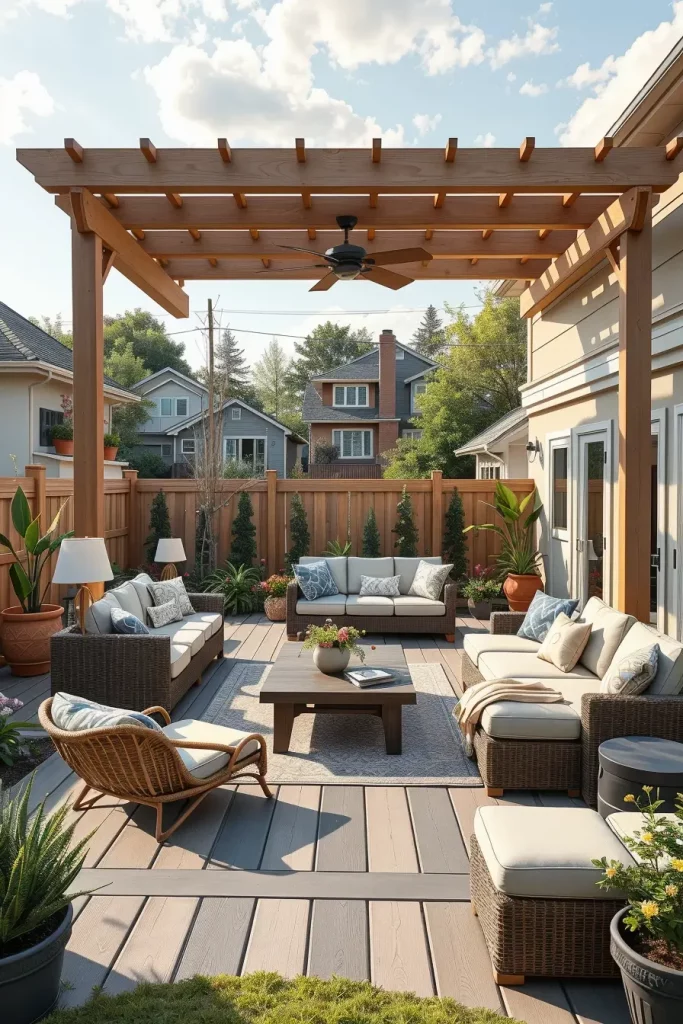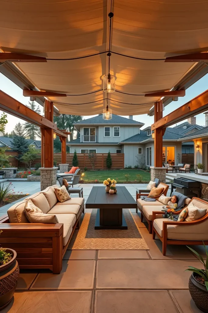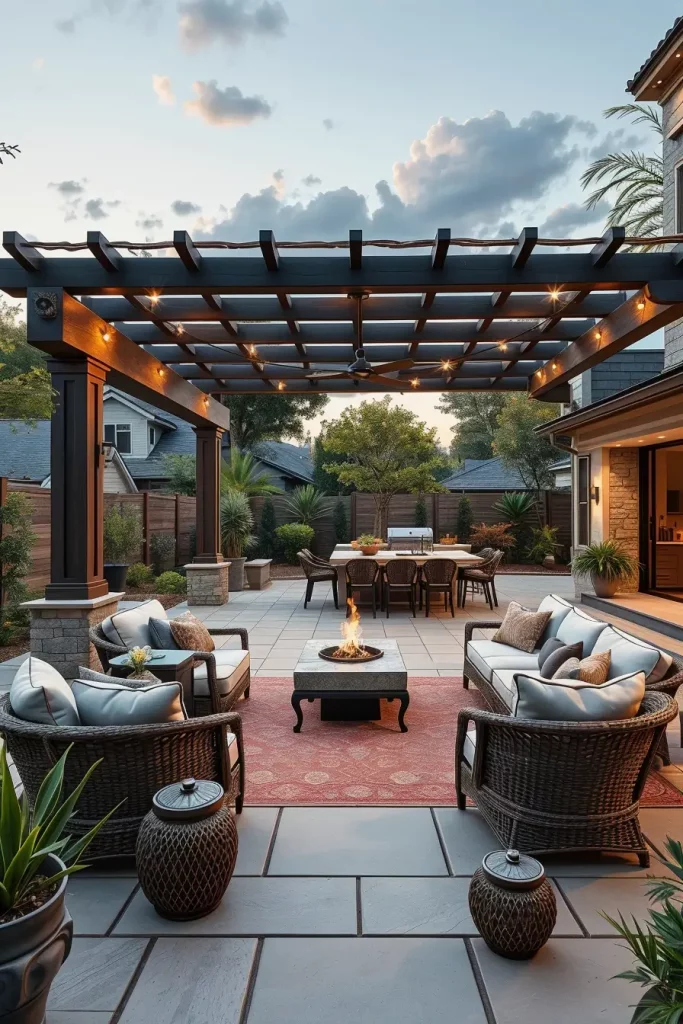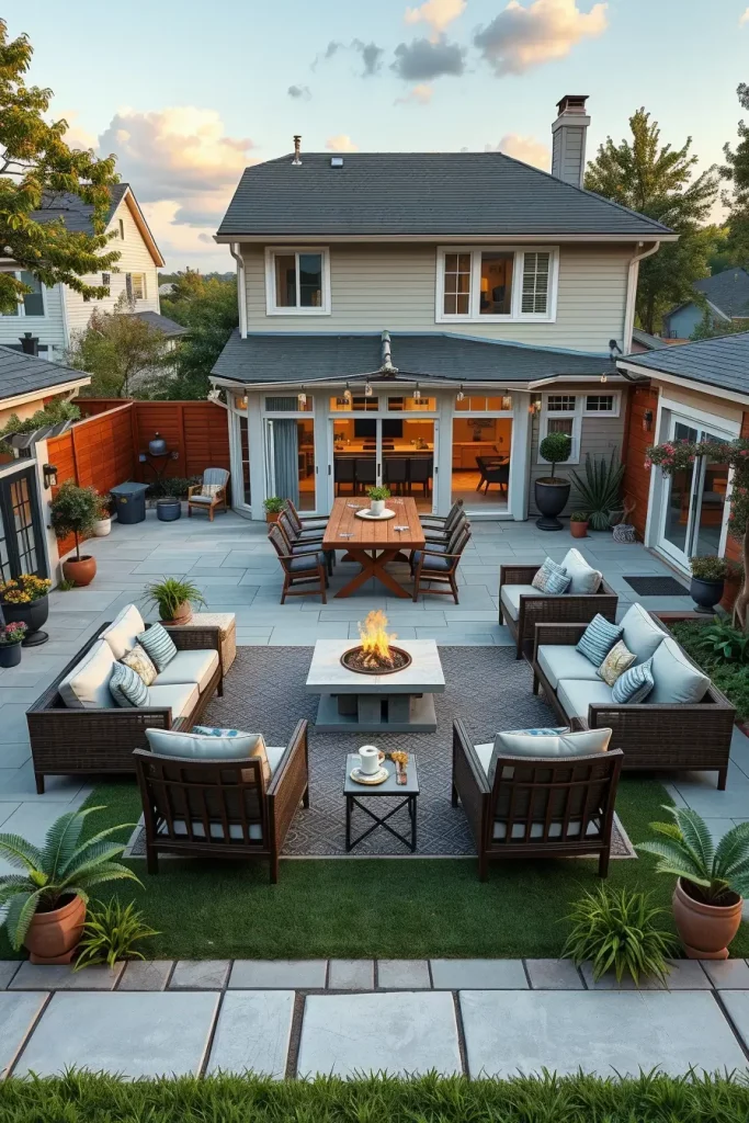 Key furniture pieces include sectional outdoor sofas, long dining tables, and movable accent chairs that can adapt to different group sizes. I always suggest lightweight yet sturdy materials so the space can be reconfigured effortlessly. Shade structures, such as pergolas or retractable canopies, help define zones without closing them off.