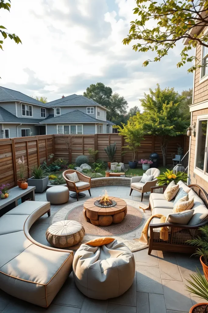 Key furniture elements include curved benches, movable poufs, built-in seating along walls, and lightweight accent chairs. I always recommend mixing fixed and flexible seating so the layout can expand or contract depending on the number of people. Materials should be durable yet visually cohesive with the rest of the backyard design.
