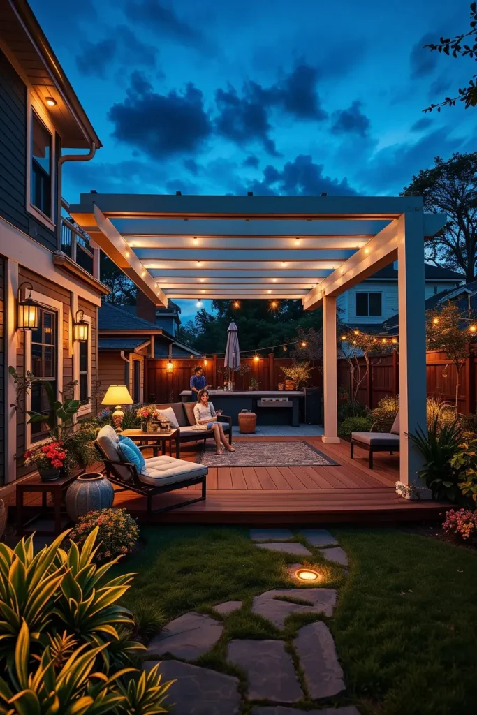 I typically include recessed deck lights, low-glare pathway lighting, overhead pergola fixtures, and subtle wall washers. Each lighting element serves a purpose — pathway lights improve safety for children, while dimmable ambient fixtures allow families to transition from energetic evenings to calm nighttime routines. I also incorporate smart lighting systems for flexibility and energy efficiency.