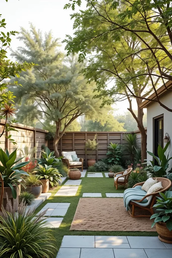 To complete this layout, I would suggest incorporating sound-masking elements like water features or rustling plants, which subtly enhance privacy while enriching the sensory experience.
