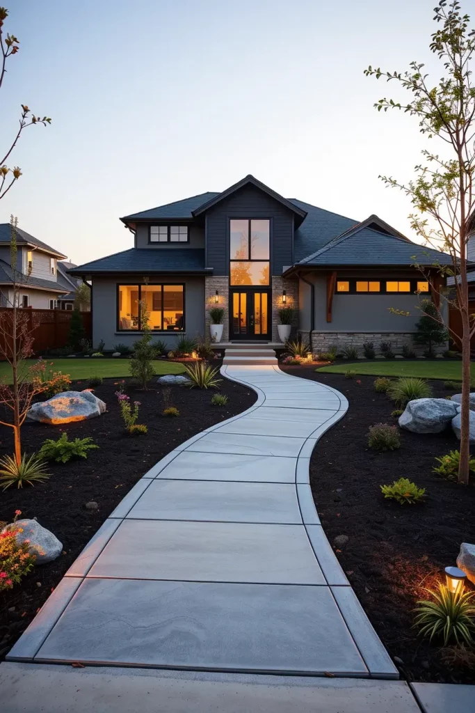 Materials such as poured concrete, stone pavers, or textured slabs work best when paired with gentle curves. I often design these paths alongside layered planting beds or low walls, allowing the pathway to feel integrated rather than imposed on the landscape.
