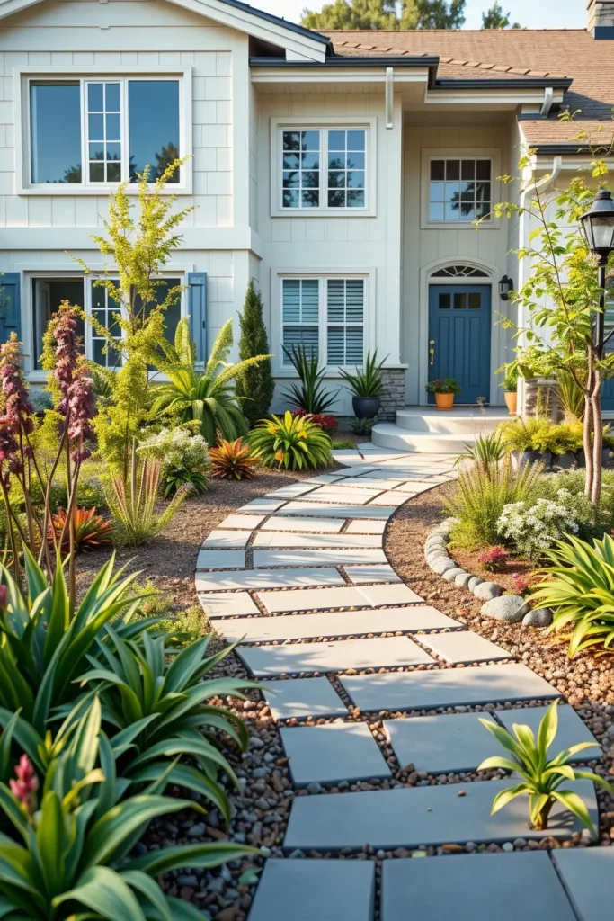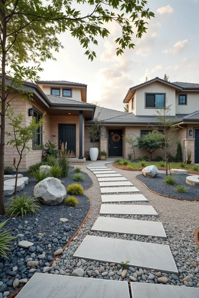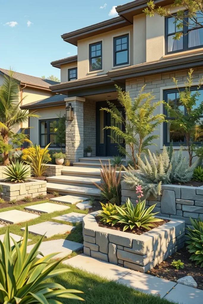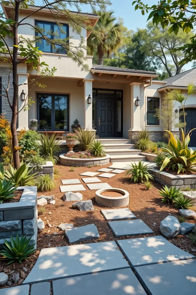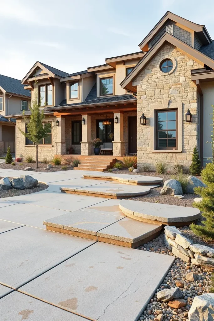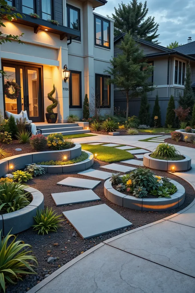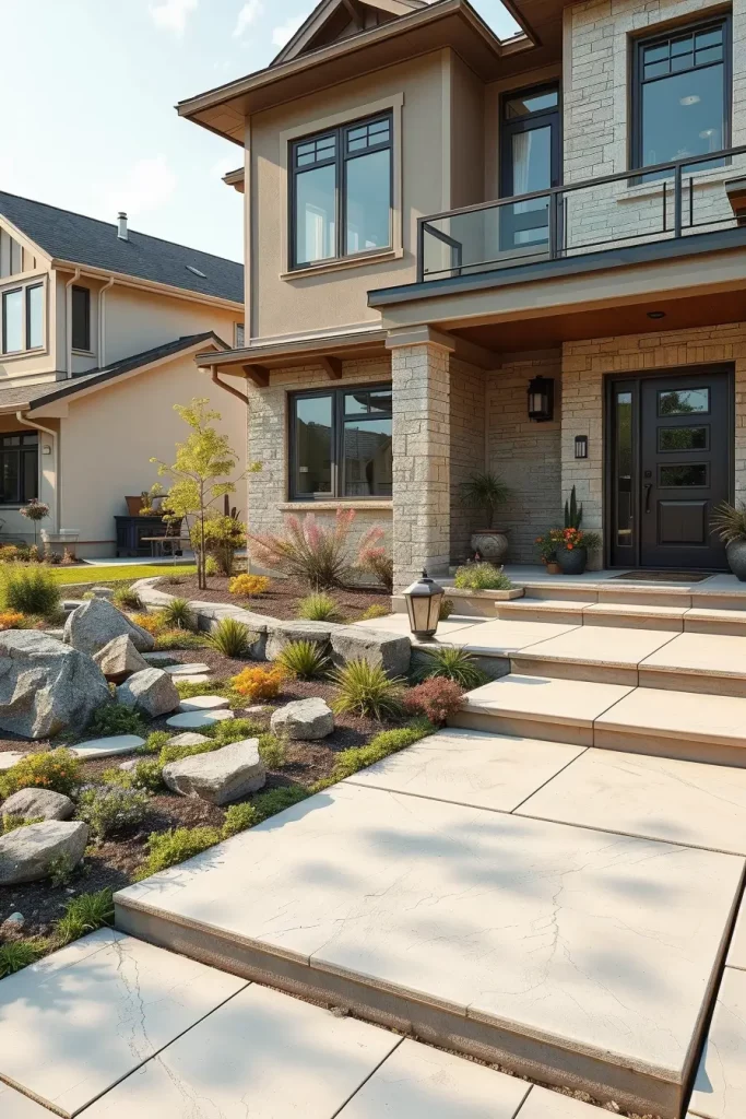 Stone and concrete have become defining materials in creative and stylish front yard landscaping for 2026. I see these materials as foundational elements that establish permanence and structure. When used thoughtfully, they create a clean, modern base that supports more expressive design features.