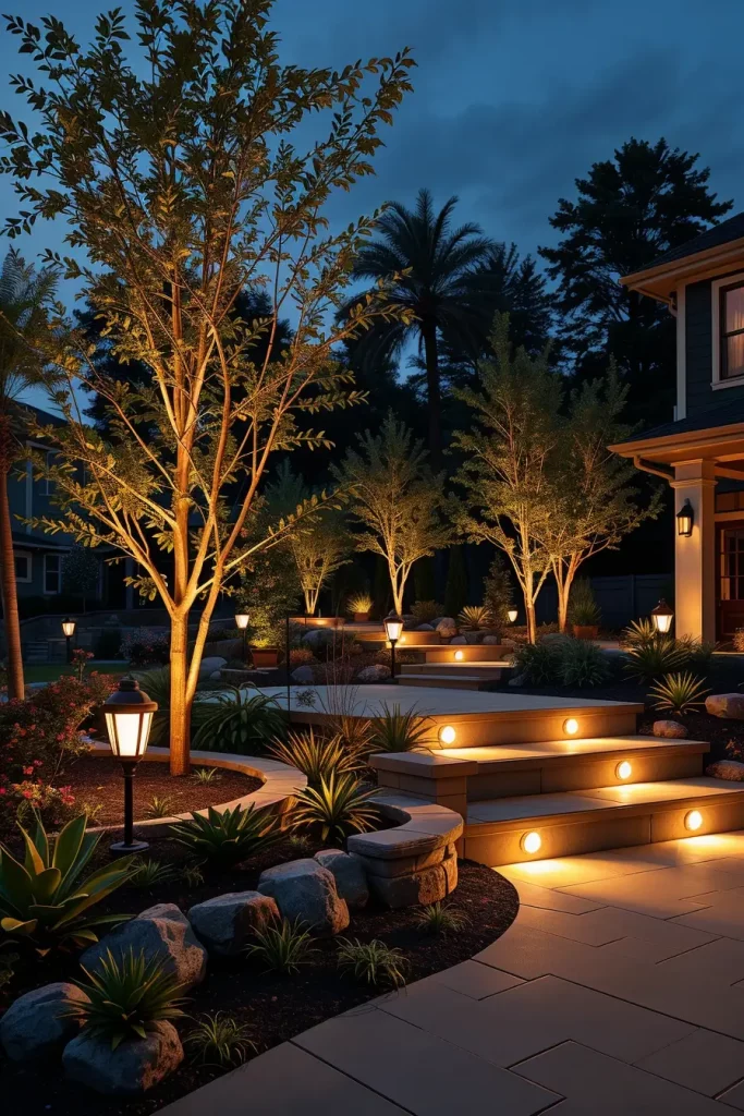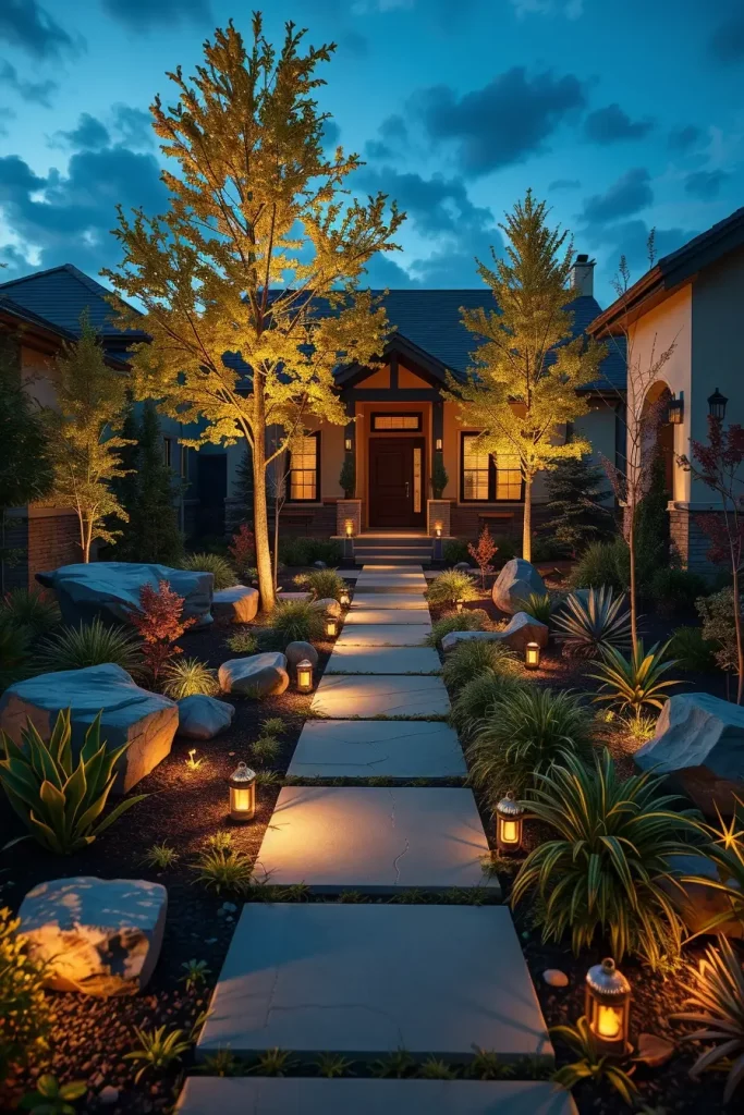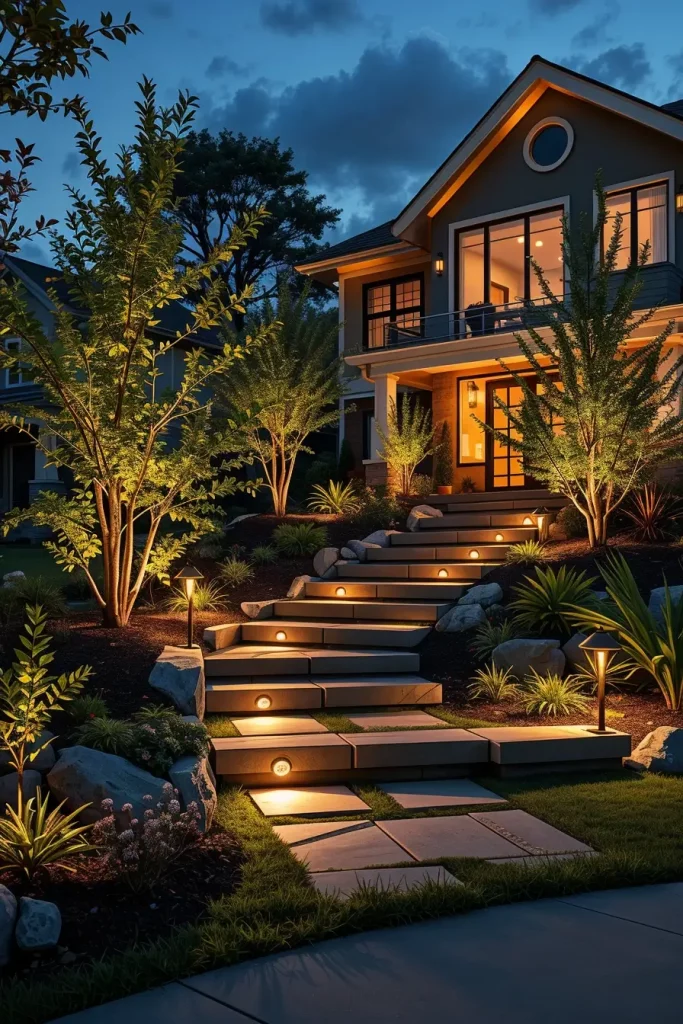 I integrate layered lighting including pathway lights, uplighting for trees, and concealed LEDs within steps or seating. During the day, plant textures and materials take priority, while at night, light reveals form and depth. This dual-purpose approach ensures the front yard feels complete at all hours.