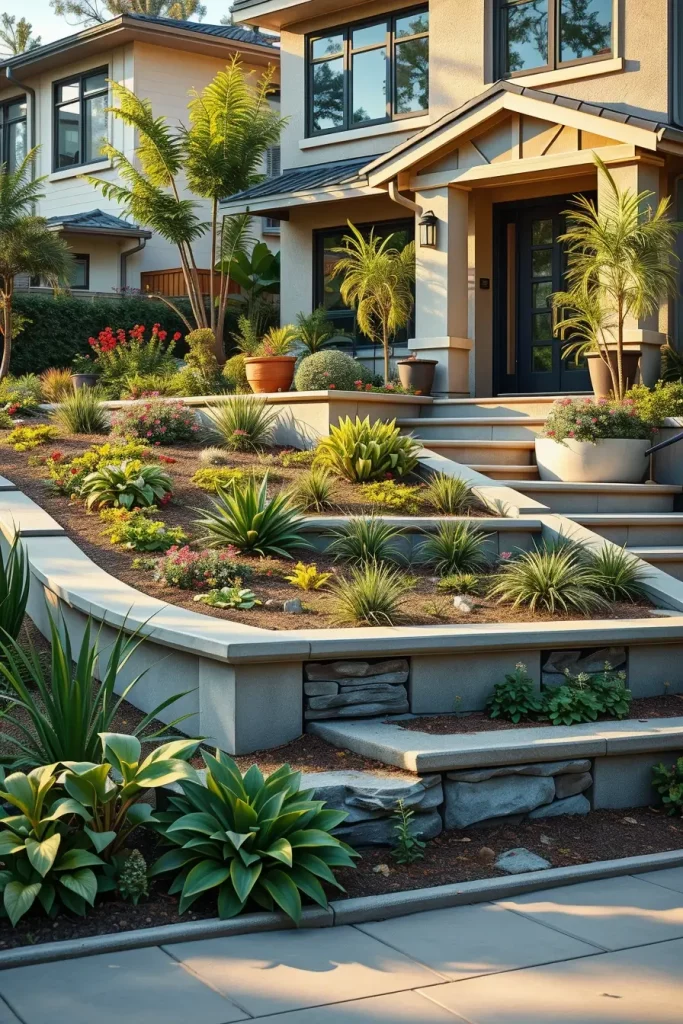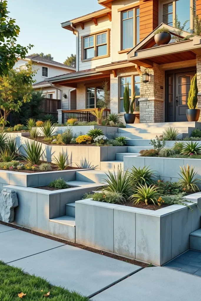 Front Yard Landscaping With Elevated Planters And Levels