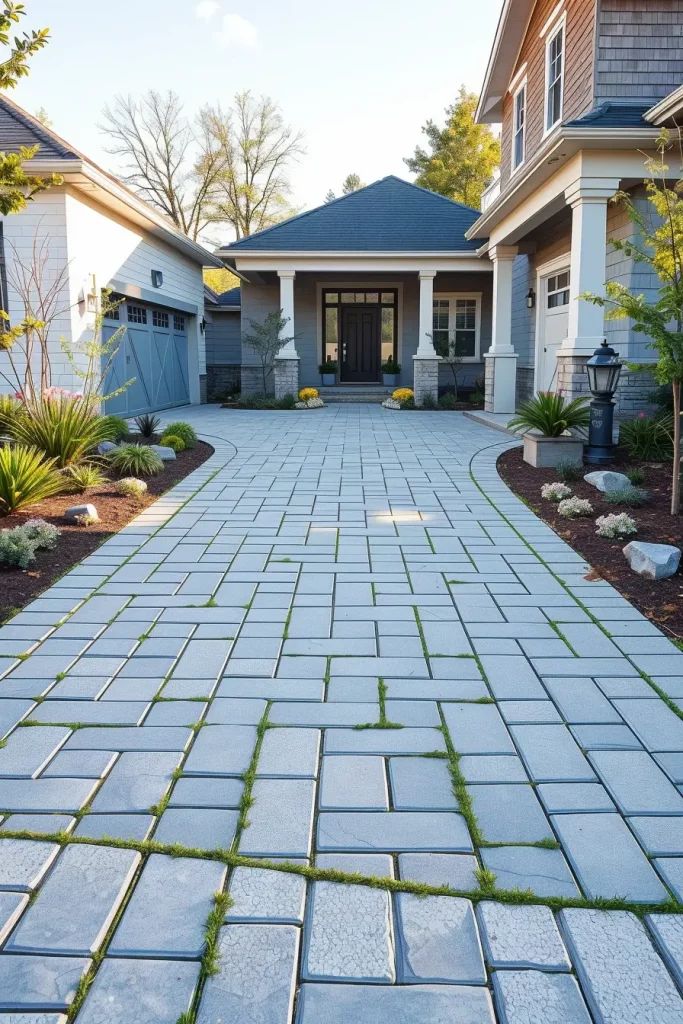 I often use permeable pavers, textured concrete, or stone strips that align with walkway materials. Green joints filled with grass or ground cover soften hard surfaces, while driveway edges are framed with low plantings or sculptural lighting. This creates continuity instead of separation.