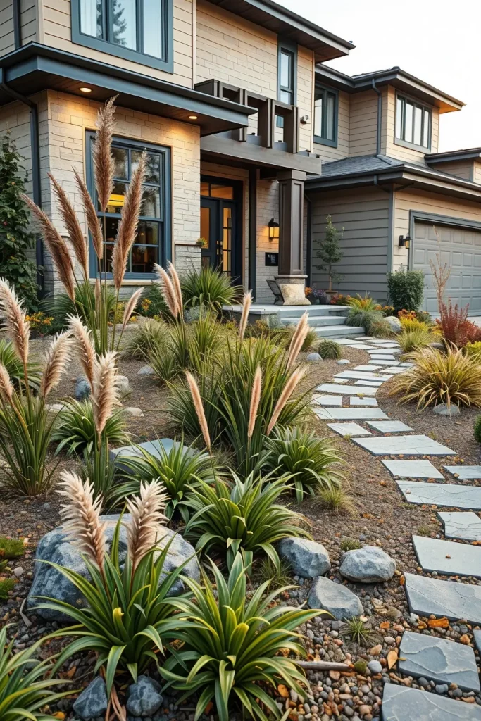 In front yard landscaping 2026, layered textures play a central role in creating depth and visual richness without overcrowding the space. I approach this concept by combining contrasting surfaces and materials in a controlled way, allowing each layer to support the overall composition. Texture becomes a design language that guides the eye from the sidewalk to the entry.