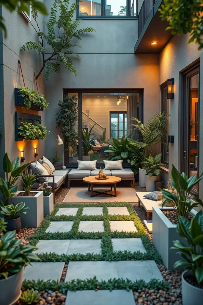 I rely on vertical gardens, floating steps, slim planters, and built-in seating to maximize usability. Materials with reflective surfaces or light tones help visually expand the area, while layered lighting creates depth. Every element must earn its place, so clutter is carefully avoided.