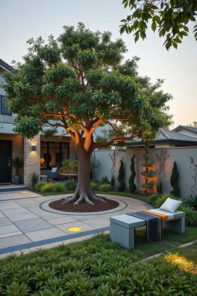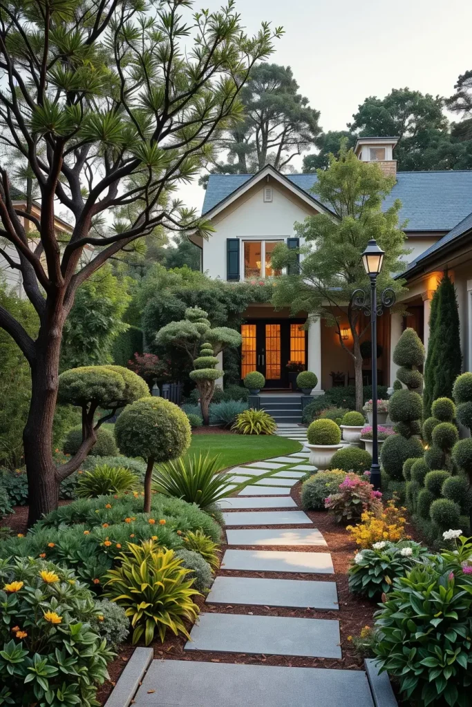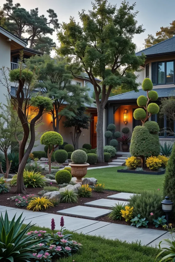 Statement trees are becoming a defining feature of designer front yard landscaping in 2026. I use them as living sculptures that anchor the entire design and immediately establish identity. A single well-chosen tree can replace multiple decorative elements while offering shade and scale.