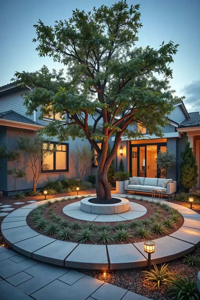 To complete this concept, I would recommend adding uplighting specifically calibrated to highlight the tree’s structure at night, reinforcing its role as the focal point.