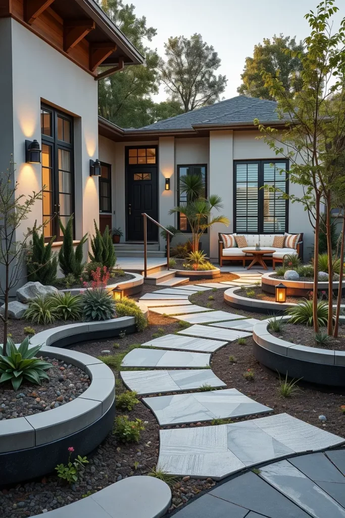 Curved pathways are a key element of unusual front yard landscaping in 2026. I use curves to soften modern architecture and introduce a sense of movement and discovery. Unlike rigid straight paths, curved walkways guide visitors naturally and create a more engaging experience.
