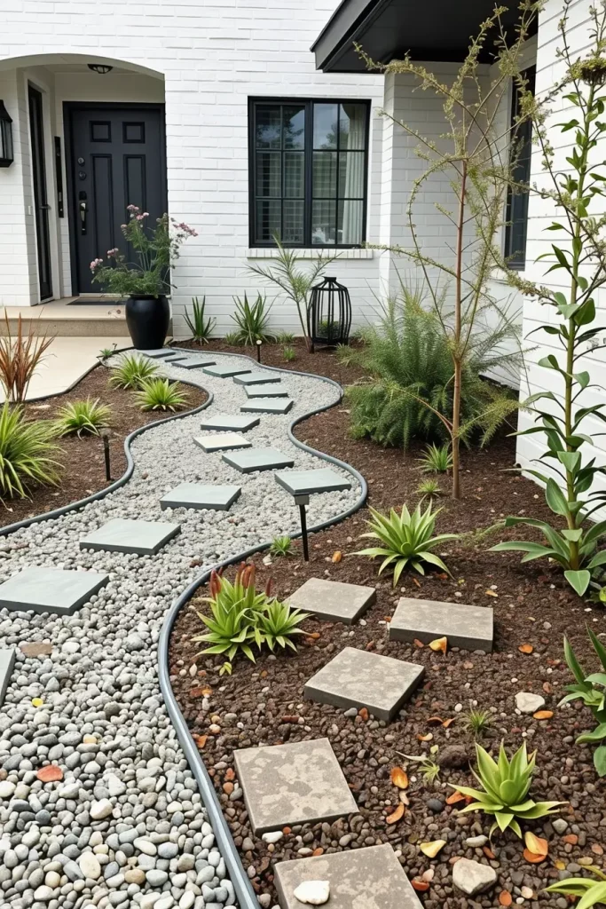 I typically combine fine gravel paths with creeping ground covers, low succulents, or native grasses. Steel or stone edging keeps the layout crisp, while stepping stones or concrete slabs provide functional circulation. This combination allows for a creative and unusual front yard that remains low-maintenance and visually refined.