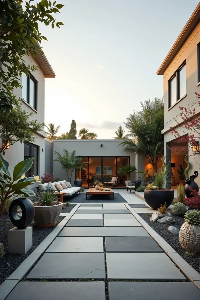 In practice, this means offset walkways, irregular planter placement, and varied plant heights. I balance these elements with consistent materials or color palettes so the design feels intentional rather than chaotic. Statement trees or sculptural features often anchor one side of the layout.