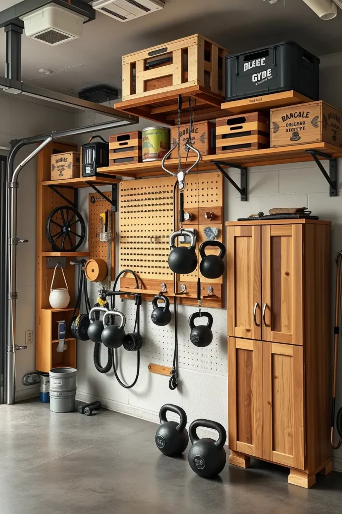 Weight plates, resistance bands, and jump ropes are so easy to misplace so for all these items there’s a vertical rack build I adore, which can also be positioned as a jump rope shelf. Old kitchen cabinets can even serve to hold smaller items such as gloves, chalk, and even hand towels. Crates can be positioned to serve a double purpose displaying for supplements while also acting as shelves. Kettlebells can be lifted out of the way when not in use, through a ceiling pulley system.