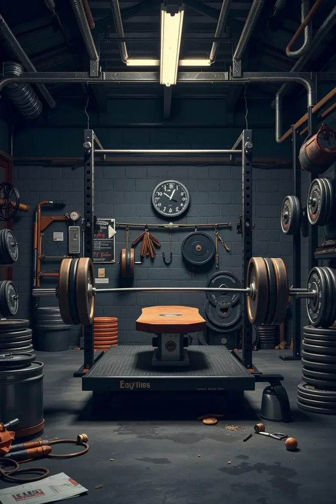While planning a garage gym for powerlifting enthusiasts, it’s paramount to include reliable and safe access to heavy-duty equipment. My focus goes into constructing a solid pedestal along with sufficient ceiling height and reinforced storage for the heavy weights. There is almost always functional rugged and raw aesthetic without decorative fluff and wasteful space.