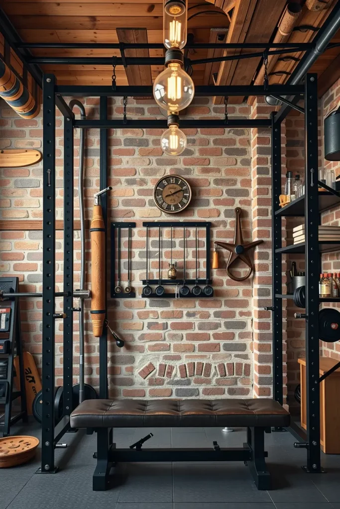 My layout would feature wood planks on one wall, with racks and benches made of matte-black metal. Lighting comes from retro-style Edison bulbs hanging from a pipe rail, while a weathered leather bench adds both function and style. Brick masonry and the exposed pipes give the gym an industrial tone. Gear is placed on metal shelving and rolling tool carts serving as both functional and decorative elements.