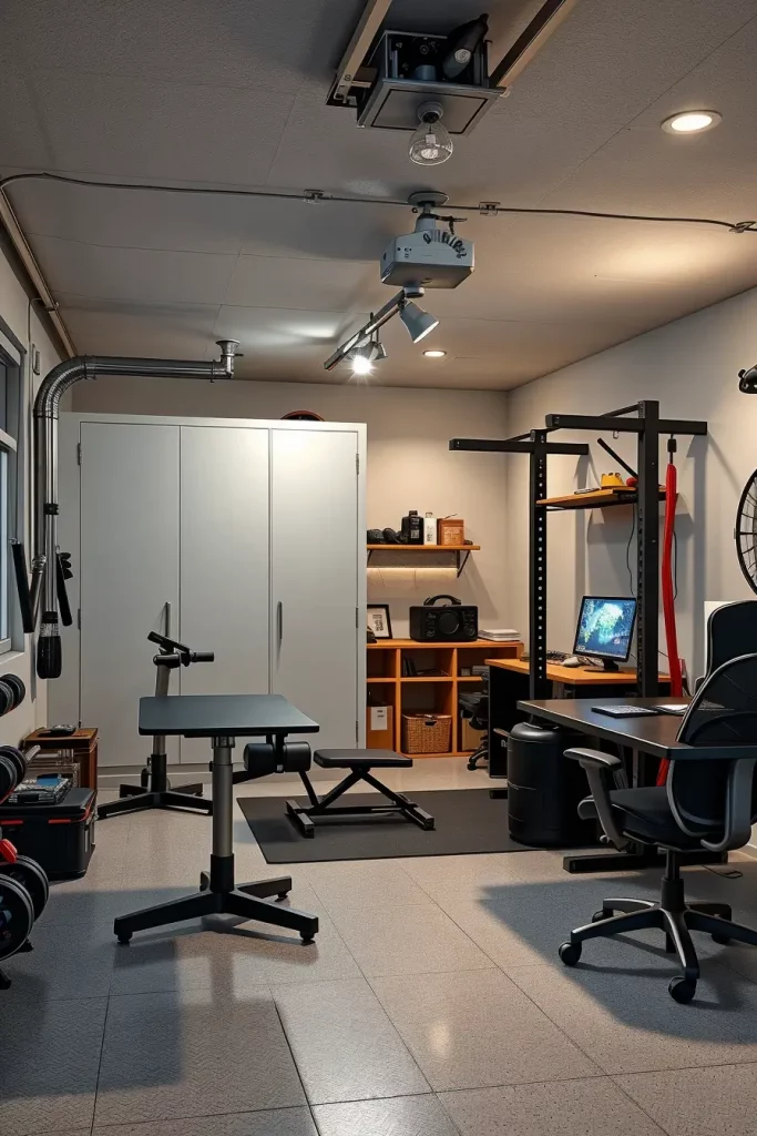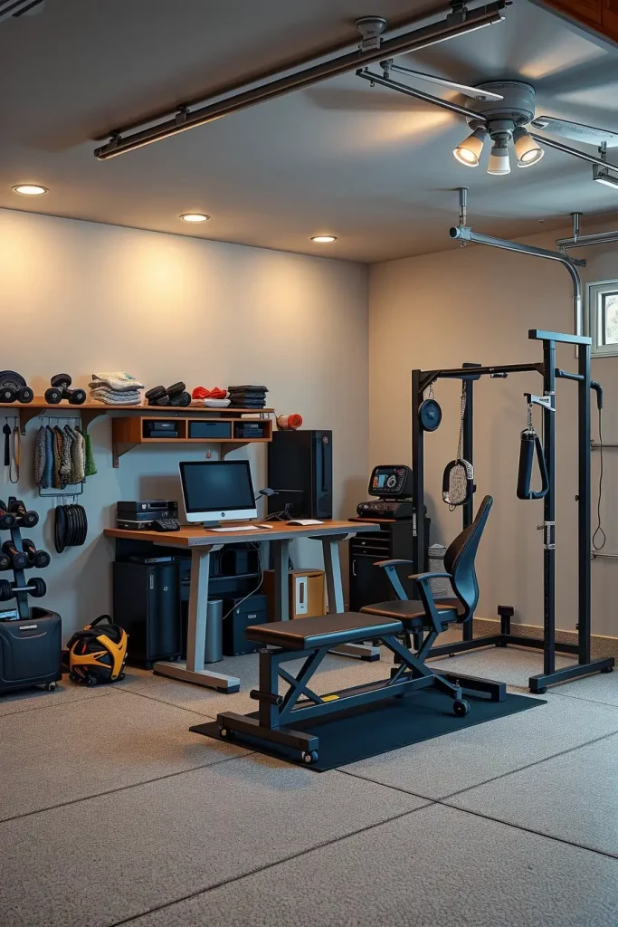 To section off the office area, I use modular partitions or room dividers. My ideal desk setup consists of a standing ergonomic, wheeled desk and a comfortable office chair. In the gym zone, I keep office supplies in a locked cabinet so they don’t mix with gym gear. For the gym zone, I install low profile equipment such as resistance bands and folding benches, as well as adjustable dumbbells. Lighting also adjusts differently for each zone, with cool daylight for working and warmer tones for workouts.