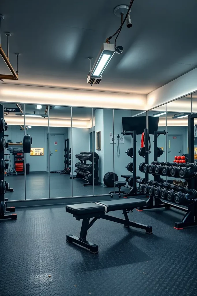 Add some carpentry mirrors and use backed wooden boards as additional supports. For the flooring, I would recommend rubberized flooring as it would elevate your professional look, protect your foundation, and, and add professional polish. Above and beside the mirrors, adjustable light fixtures should be mounted. Accompanied with a clean preserving bench and compact dumbbell rack, the setup can be completed.