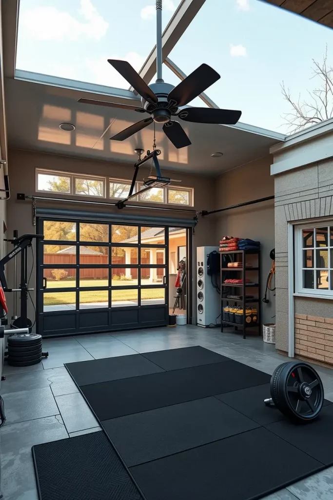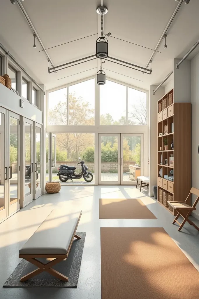 Maximizing the aesthetic appeal of a garage Gym and a zen vibe, requires special attention to the mood and atmosphere. While designing a garage gym, lighting comes to mind first. For this setup, I emphasize the use of natural light – windows, skylights, and glass garage doors to encourage light capture and creation of zen garage gym. Natural light greatly increases the perception of space and also enhances mental perception thereby increasing enjoyment and reducing fatigue during workouts.