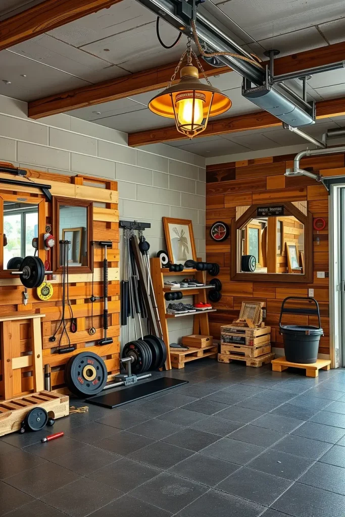 I converted some old wooden pallets into barbell and kettlebell racks. Flooring was made of rubber tire mats from recycled tires, mirrors were framed with leftover deck wood, and wall pegs were made from repurposed metal rods. Even the ceiling light fixture was salvaged from an old industrial warehouse.