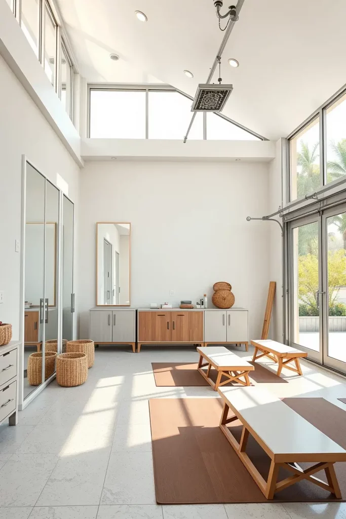 To enhance this area, I recommend adding backlit mirrors or LED strips for evening workouts. This will ensure that the space has ambiance and is functional.
