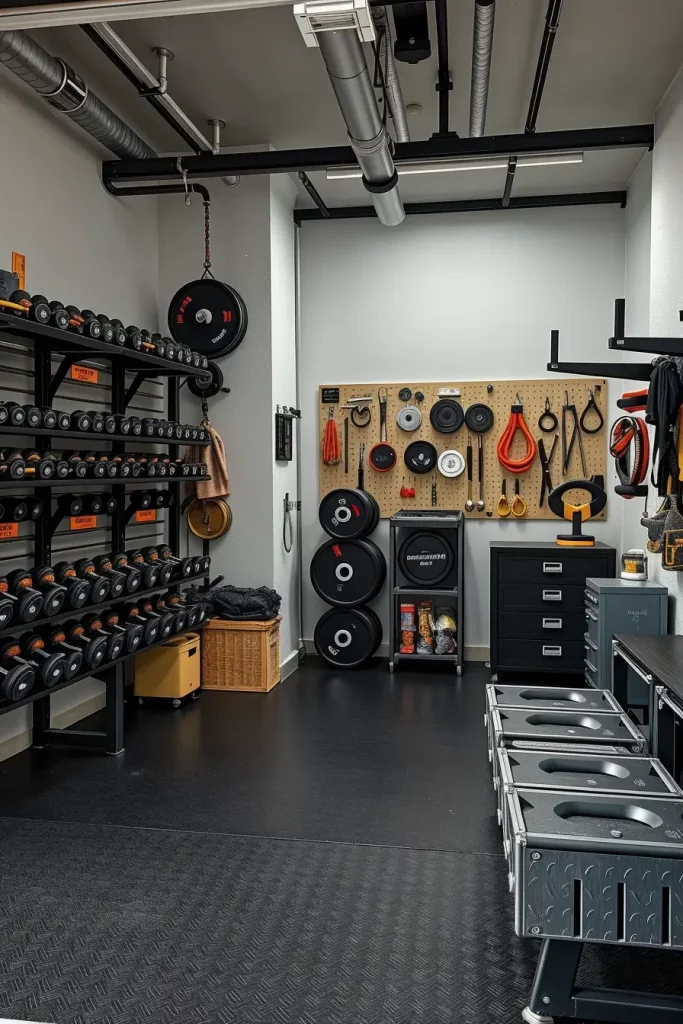 To further enhance the setup, I would equip it with labeled bins along with magnetic strips for tools and accessories to streamline the space, give it tidy aesthetics, and make post-workout cleanups effortless.