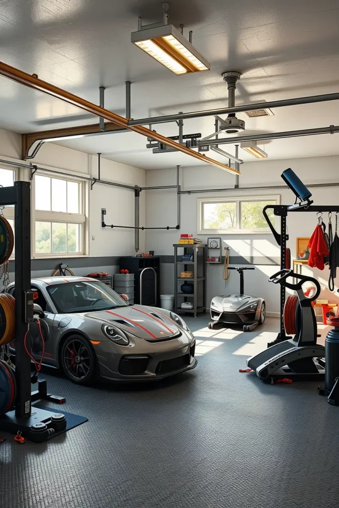 In my designs, I equip walls with power racks and treadmills for fluid movement through mid walkways, while small mirrors with compact storage fill the opposite wall. Rubber flooring tiles or rolled gym mats indicate zones and protect the underlying floor. Vertical pull-up bars, punching bags, or suspension trainers add utility. In two-car spaces, I like to devote a corner to mobility work like foam rollers and yoga mats infused with medicine balls for added versatility.
