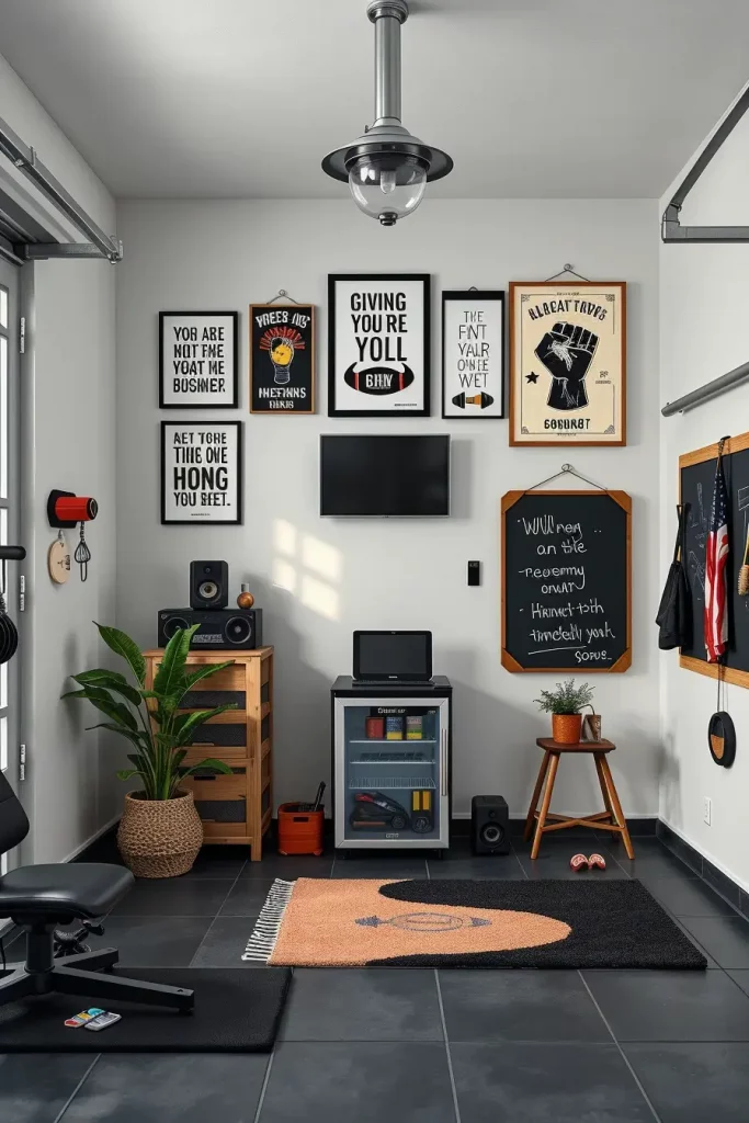 The most essential components are having the garage gym basics. The ability to add additional touches transforms the entire room into a dedicated personal workout space. Injecting personality, creativity, and inspiration is the stage of design that truly brings the room to life. Small items that embody the desired training style or favorite athletes can go a long way. I strongly suggest personalized posters alongside motivational wall decals as well.