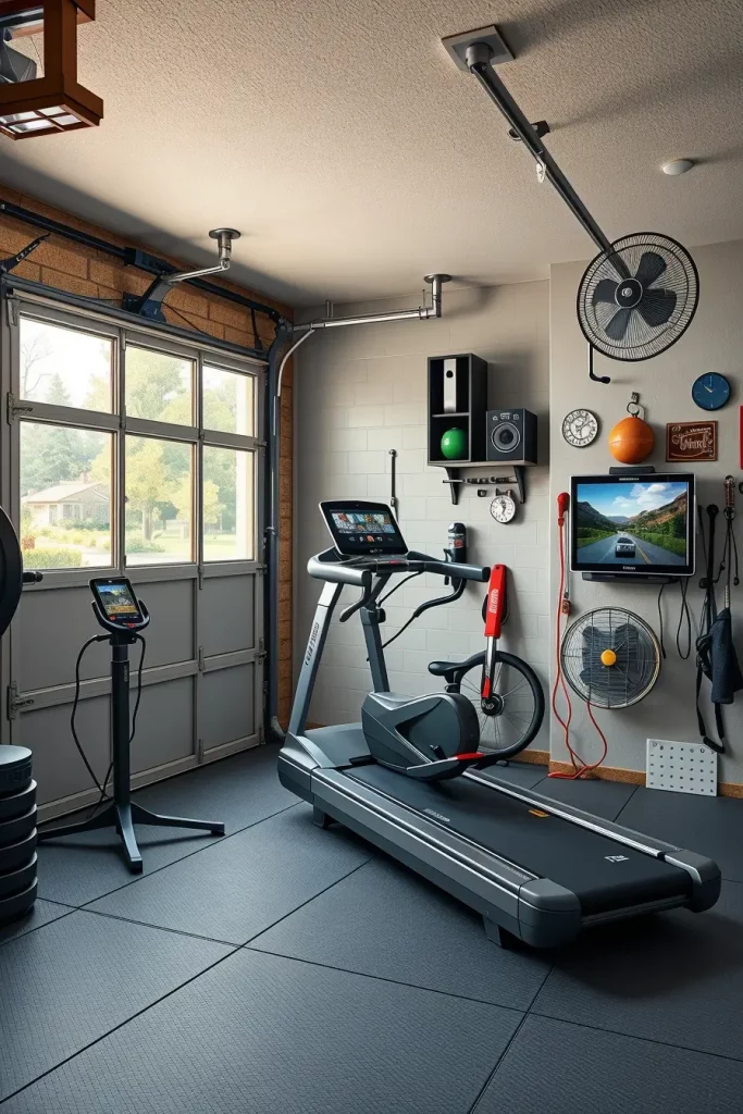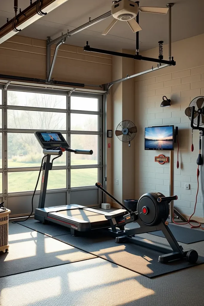 In my experience, the focus and mental clarity of a person using cardio equipment is improved when there is natural light. Shape magazine mentions that garages with cross-ventilation or expansive doors facing the outside also make doing cardio more enjoyable and help reduce sweat. Personally, I installed a small fold-out shelf that holds a water bottle, towel, and wireless earbuds.