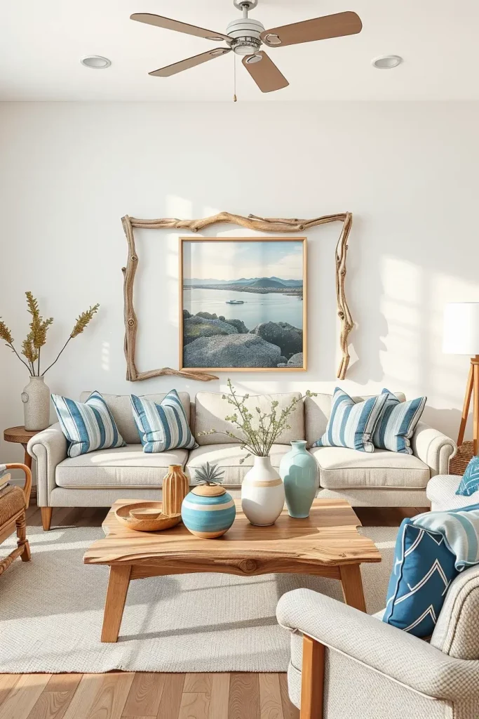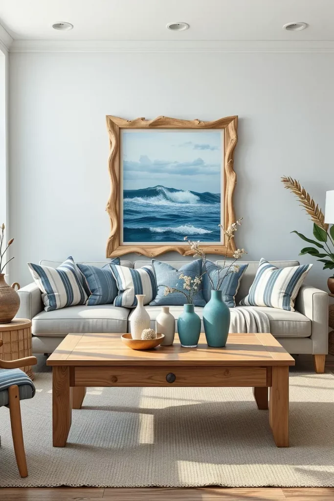 I place driftwood picture frames, some ceramic vases in ocean-like colors and jute or woven rope coasters in my living room. Having a light blue pillow or a striped cushion in the room creates the nautical feel of sea air. It’s nice to also combine natural things like coral sculptures and beach glass in various bowls I have. Everything about the place is tailored to your needs, not arranged based on a theme.