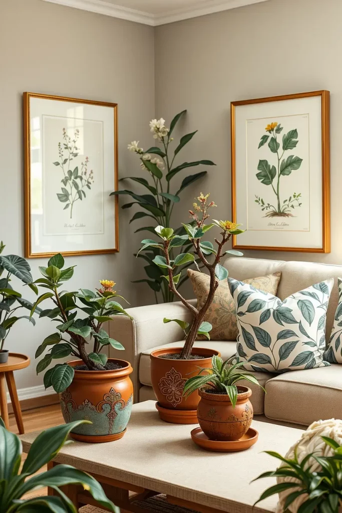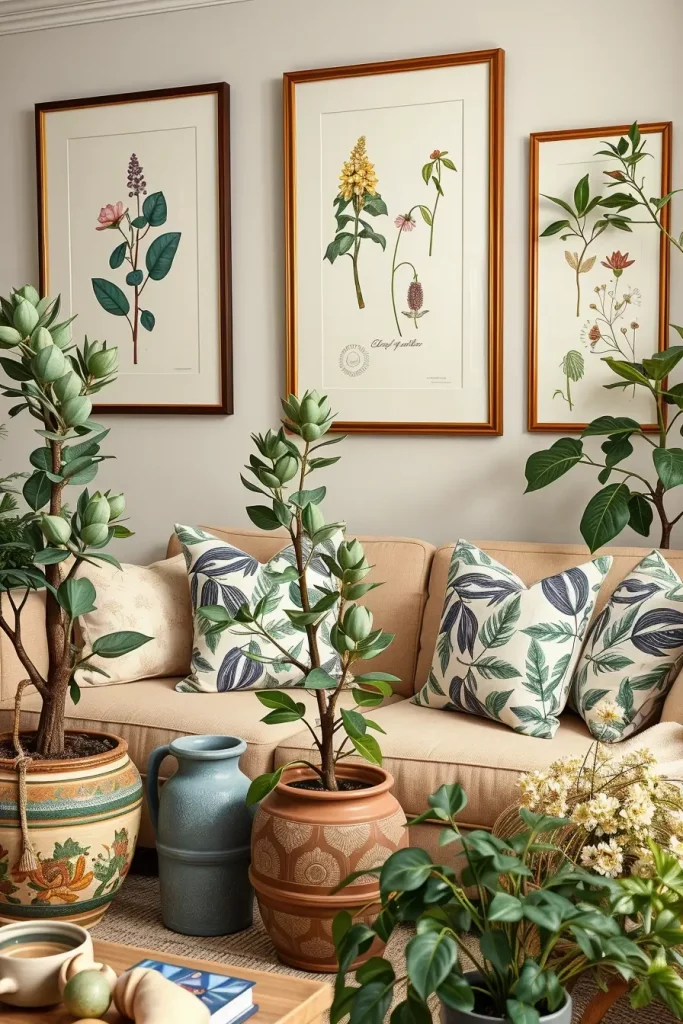 The potted eucalyptus is situated in clay or stone containers and the framed botanical sketches hang behind the sofa in very simple frames. Adding vintage plant drawings in a gallery style helps the wall look high-class, yet still uncluttered. Some leafy-patterned pillows or curtains made in colors such as sage or gray-green often tie the overall look nicely together.