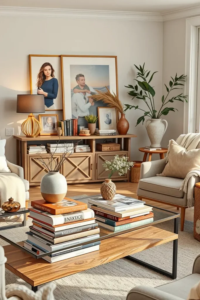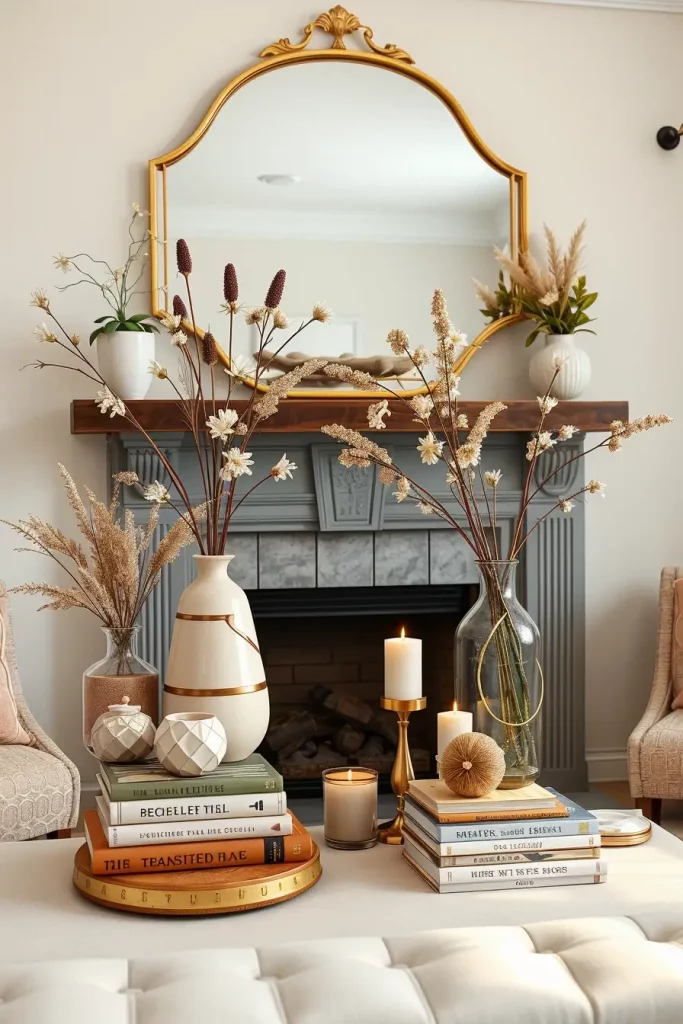 In most cases, I combine ceramic and glass vases with some inside, displaying dried wildflowers or pampas grass. I add some candles in neutral colors and I may place coffee table books or framed pictures for the holidays. Rather than using pumpkins or fall-related images, I center my outfits on choosing burnt orange, sand, blush and tan colors.