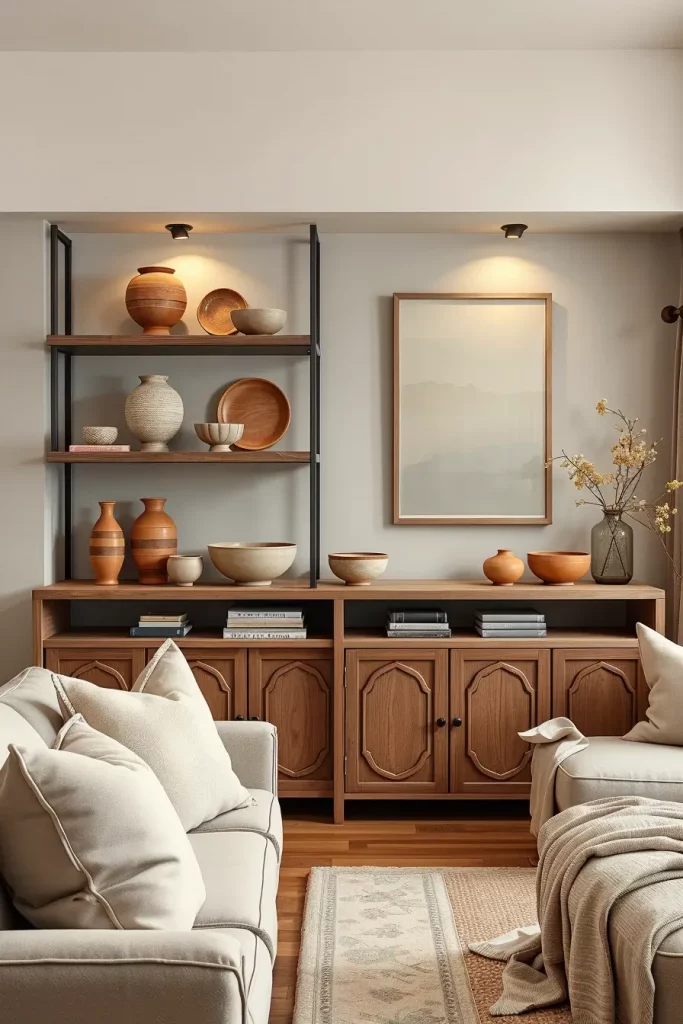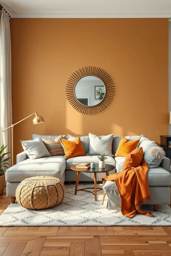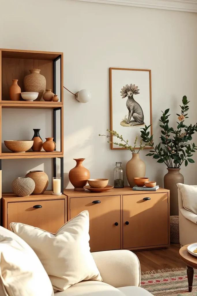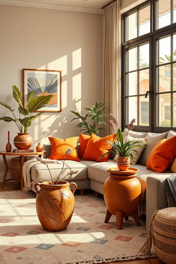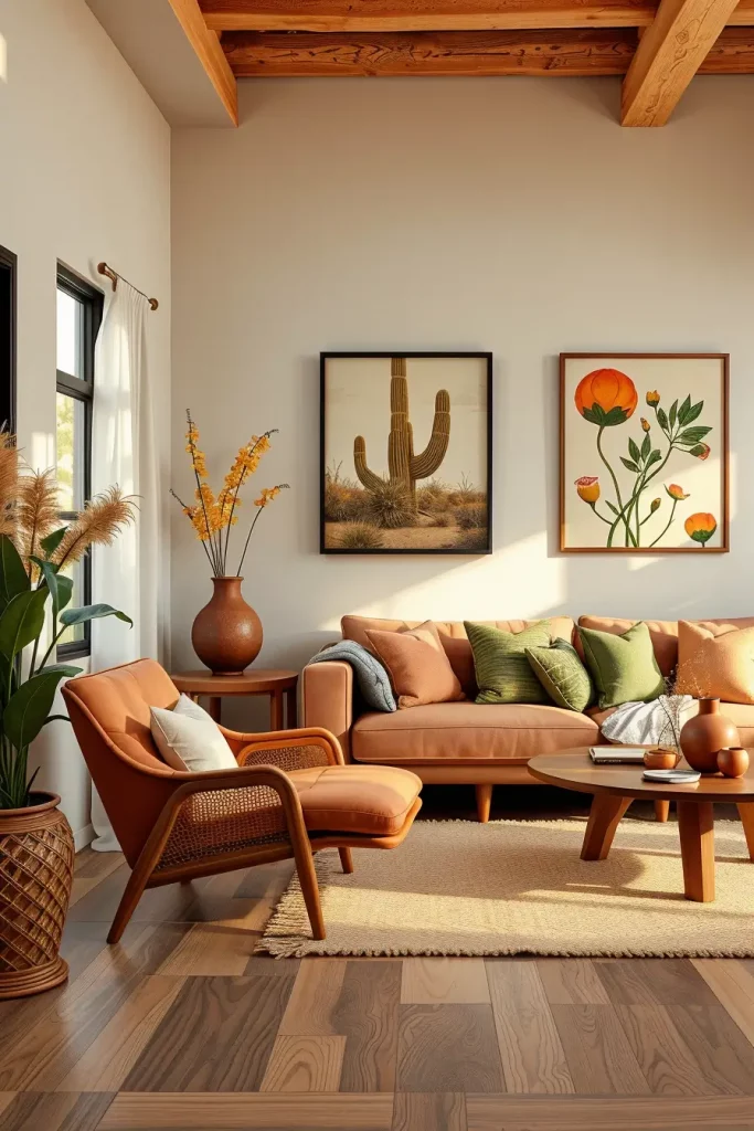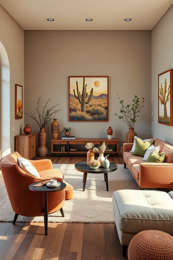 A neutral background of white or light greige walls is first and then I set up my accent pieces with rust, ochre, muted terracotta and mossy green. You can make a beautiful statement with a sand-colored sofa and walnut wood legs or a clay-toned accent chair. Hanging a framed picture of desert sand dunes or other organic shapes helps bring out the feeling you want. Choose throw pillows and vases in the colors of ochre or sienna for this theme.