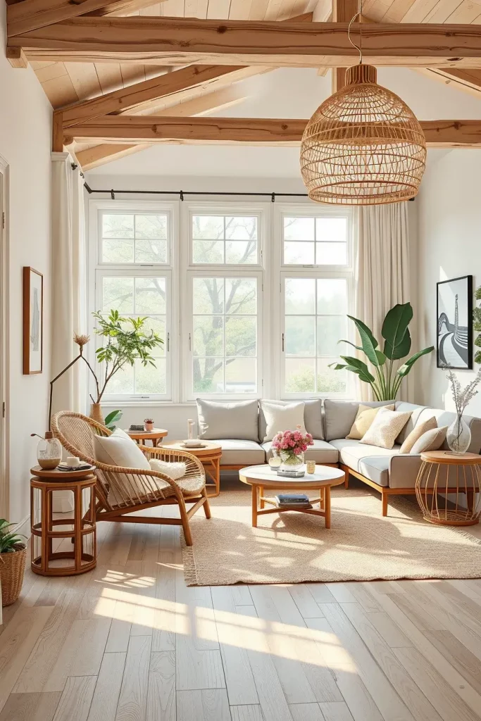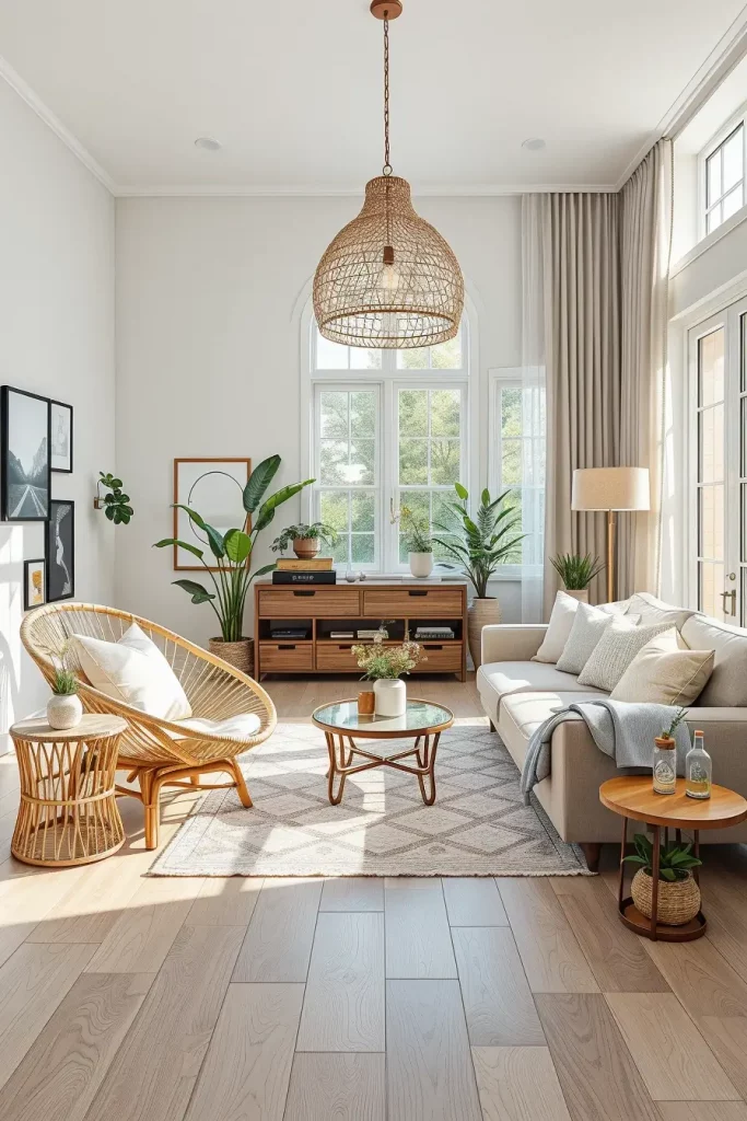 In August, I chose to style a living room with a pendant lamp and a planter stand made from rattan and it became cozier and reminiscent of a vacation spot. The editors at Domino suggest teaming rattan and wood colors to add a rich look without going overboard with design.