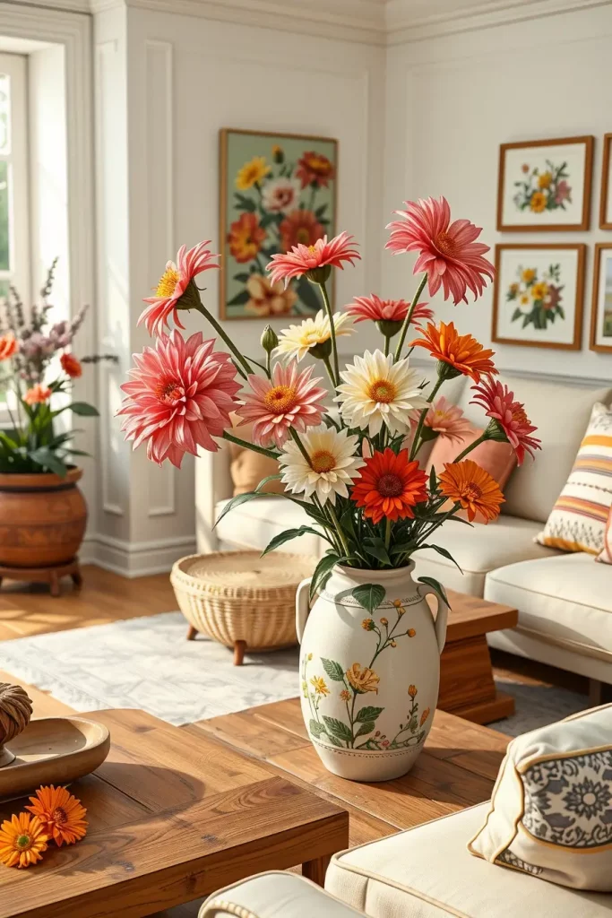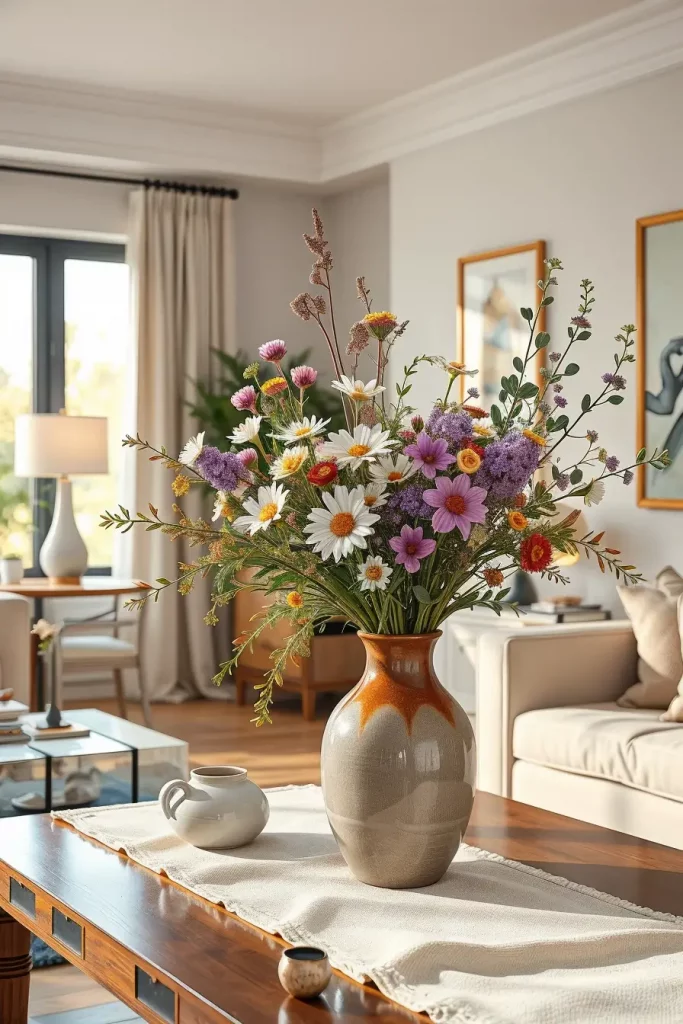 I discover that flowers are a wonderful way to lift the atmosphere in a living room. The magazine notes that using seasonal flowers helps your home reflect nature and become more emotionally appealing.