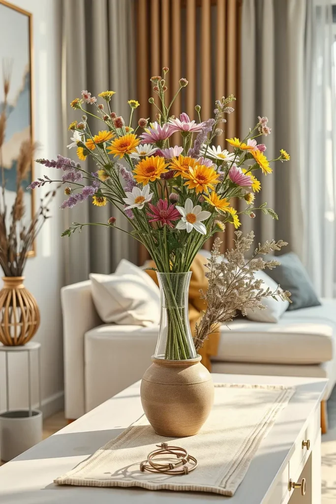 Although I enjoy floral decorations, in my summer living room I move away from fresh flowers and blend in unique dried varieties. So, there is a unique feeling seen that connects the rich excitement of summer with the gentle signs of fall. I tend to include wheat stalks, eucalyptus and bunny tails among the late-flowering wildflowers to achieve a nice contrast in their appearance.