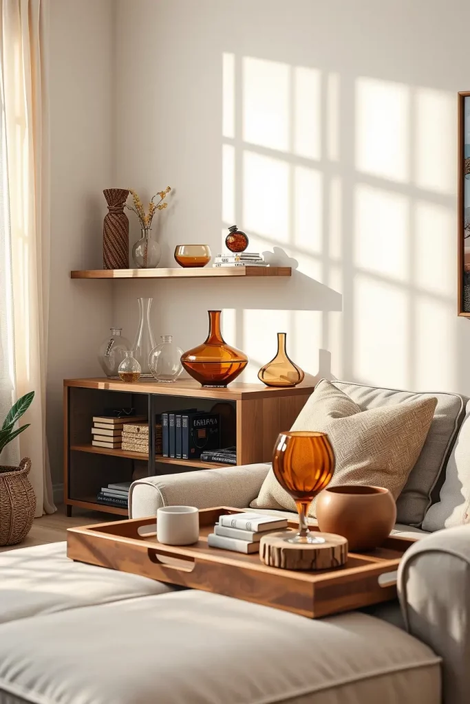A way to enhance this area is to put a glass bowl on a natural wood tray, along with some similar ceramic pieces.