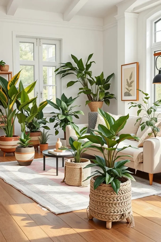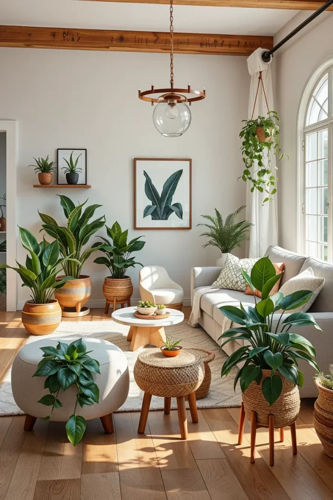 I arrange plants at different heights by placing larger ones by the window and smaller ones on furniture. I add even more interest to my potteries by combining matte ceramics, woven baskets and reclaimed wood planters. Merging these two plants make the space more interesting without crowding it.