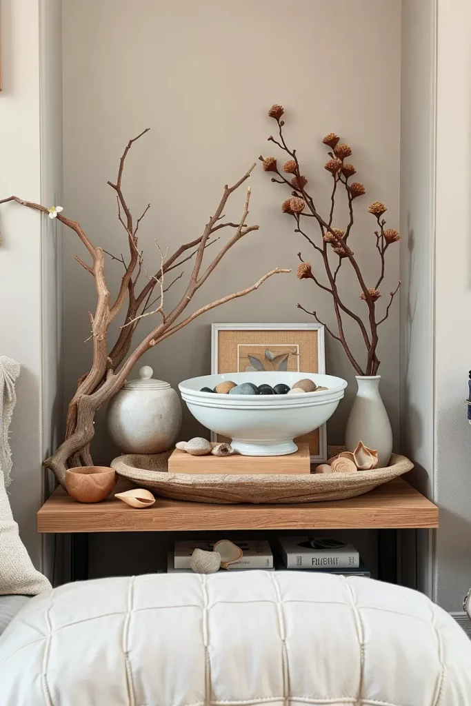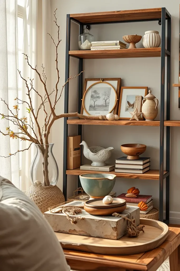 Grouping these things in small numbers and with a focus on earthy colors, I put them on my bookshelves or console ledges. The decoration stands out best with simple items like neutral books, ceramic bowls and metal trinkets grouped nearby. You should leave a little space empty which helps all the objects draw your attention.