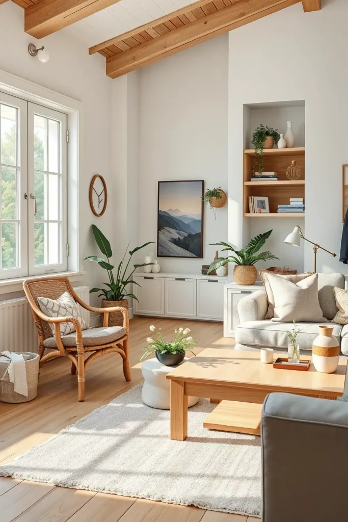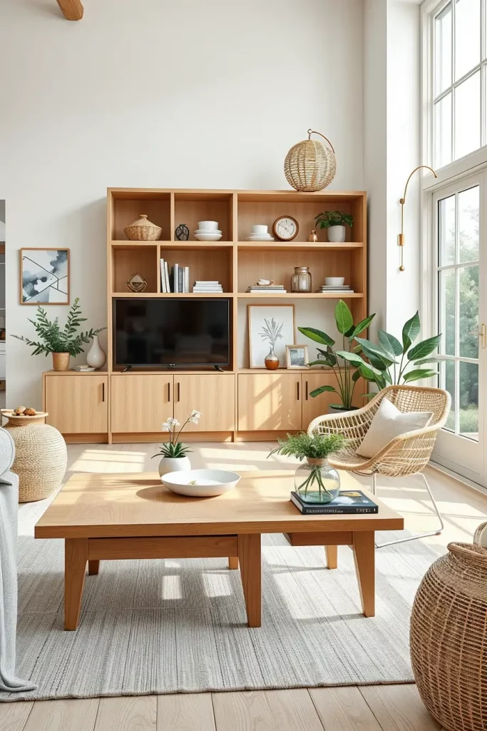 For the place, I’ve installed a light oak coffee table and matching open shelving units, both with soft and well-rounded edges. Such pieces serve a purpose while being attractive. A light wood chair where the seating is made of woven or rattan is both appealing and adds extra interest to the room. Just enough metal and stone fittings help the room avoid becoming very plain or overly rustic.