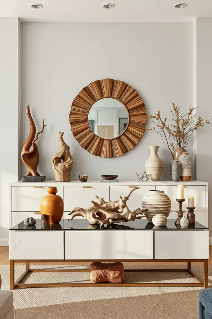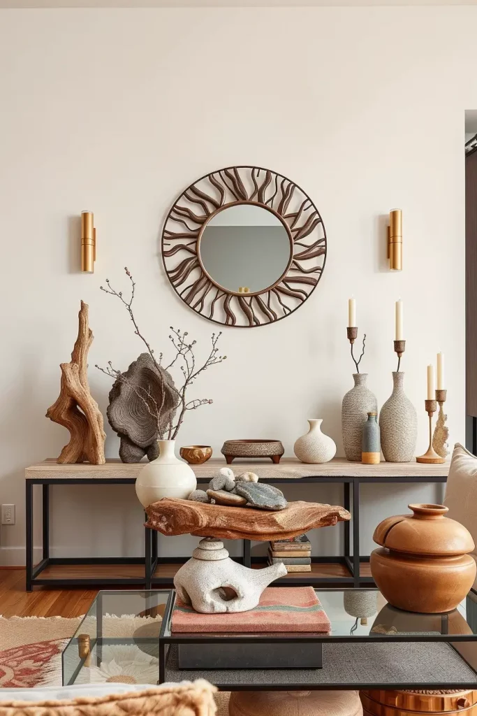 I make this concept real by putting carved wooden bowls, irregularly shaped ceramic vases and abstract stone sculptures on mantels or consoles. Wavy mirrors and different types of candleholders look good with this furniture. I usually include decorative pieces such as those from natural fibers or driftwood to capture the outdoor setting’s look and feel.